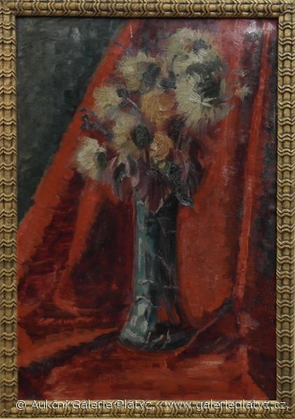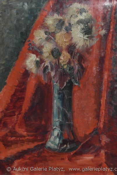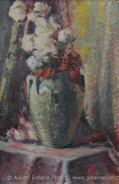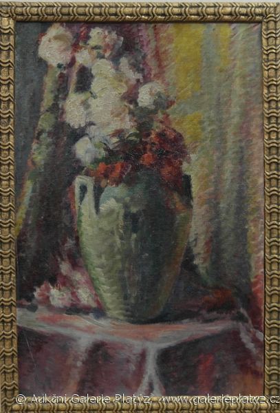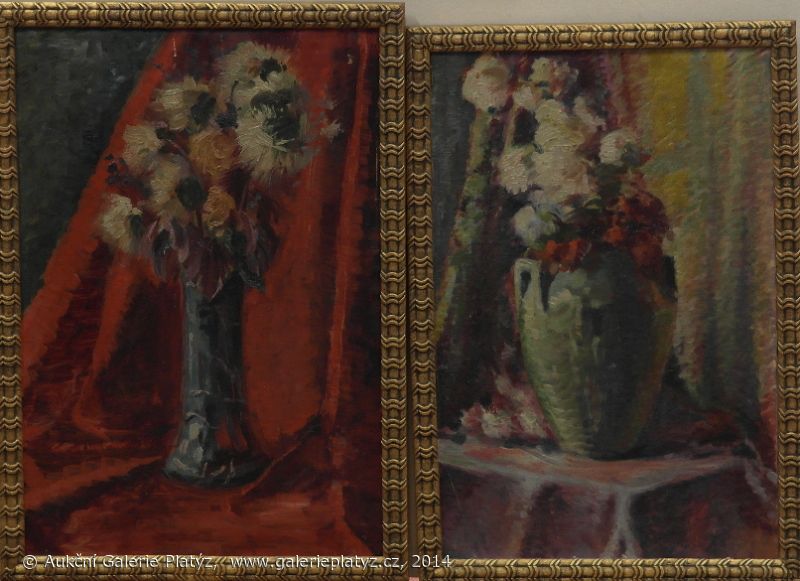 Květina ve váze, olej/karton, rozměr 57 x 39 cm, signováno vpravo dole, prohnutý karton, malba lokálně poškrábána; Květiny na stolku, olej/plátno/karton, rozměr 54,5 x 36 cm, nesignováno, volné v rámu, odřený rám