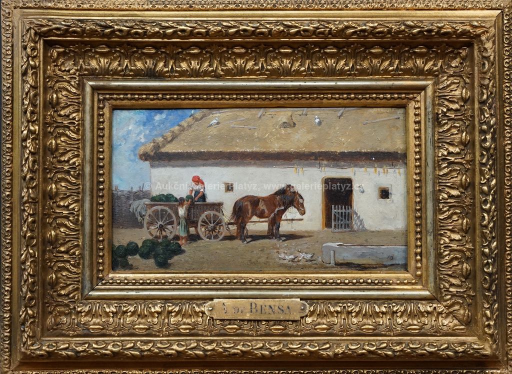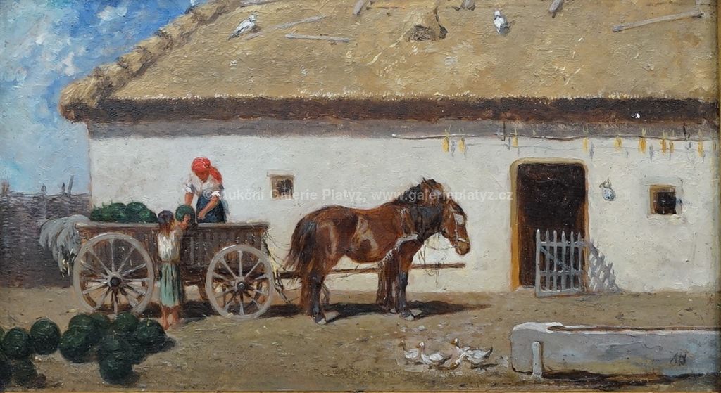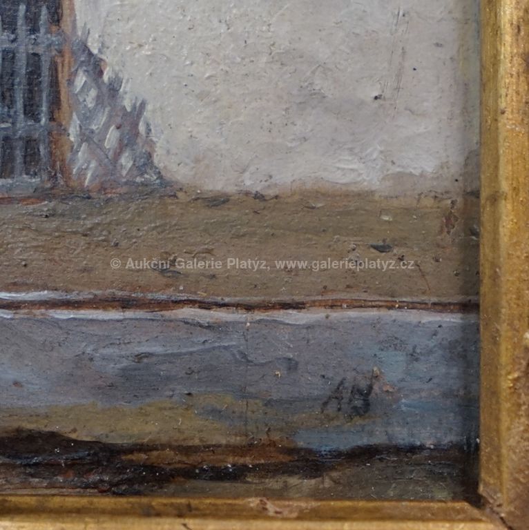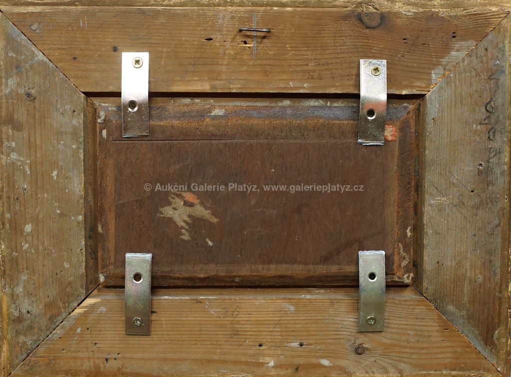 olej/dřevo, rozměr 12,5 x 22 cm, signováno monogramem vpravo dole, oděrky na dekorativní adjustaci, původní štítek