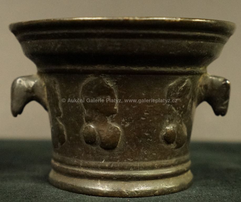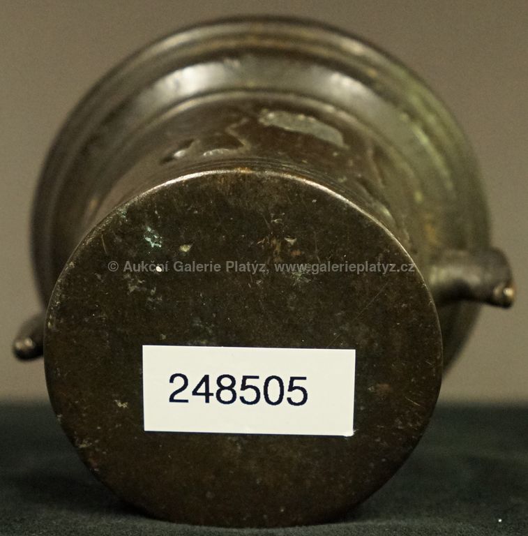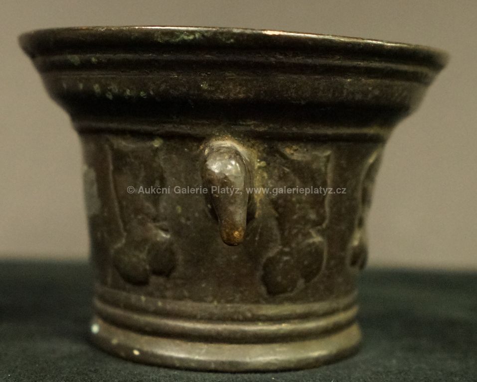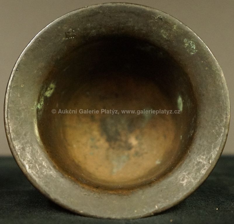 bronz, celková výška 8,5 cm, zdobeno reliéfy (renesance?), stav viz foto