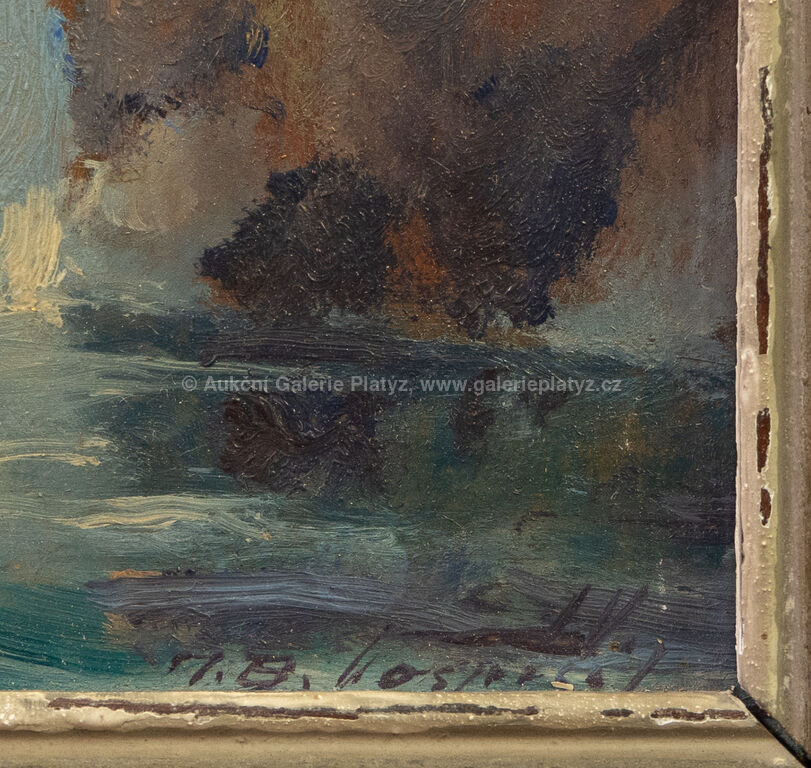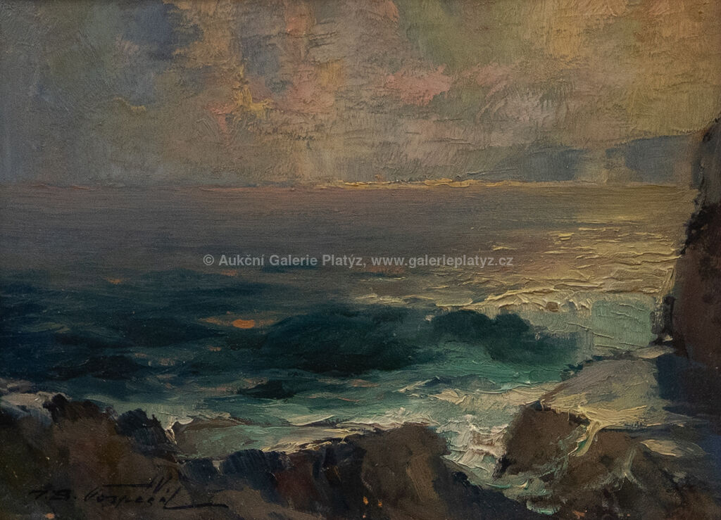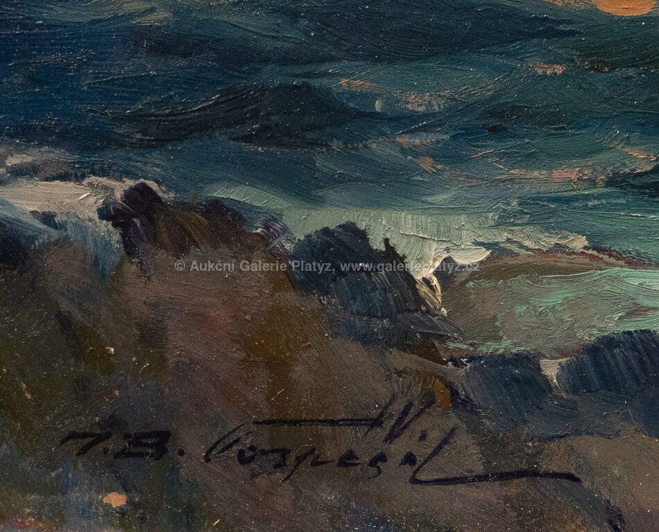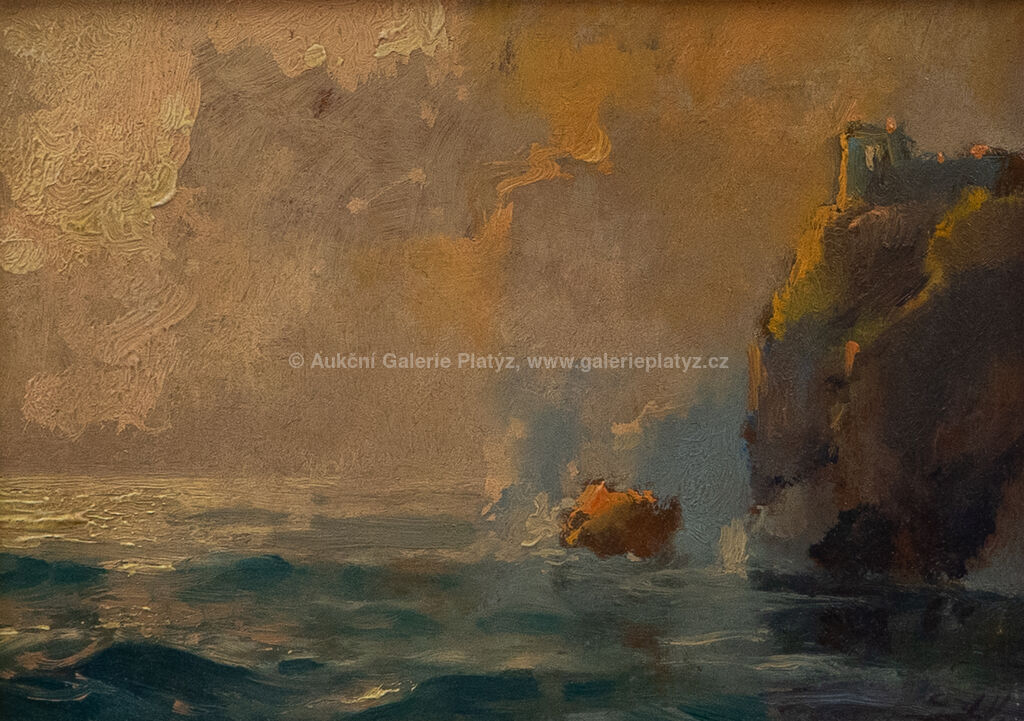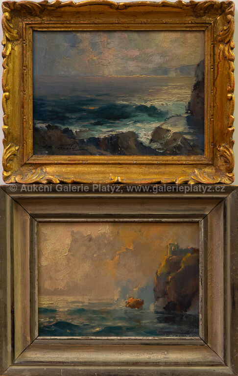 Příboj: olej/sololit, rozměr 16 x 22 cm, značeno vlevo dole, rámováno, drobné oděrky v malbě a na rámu, Z Boky Kotorské: olej/sololit, rozměr 16 x 22 cm, značeno vpravo dole, rámováno, drobné oděrky v malbě, poškozený rám