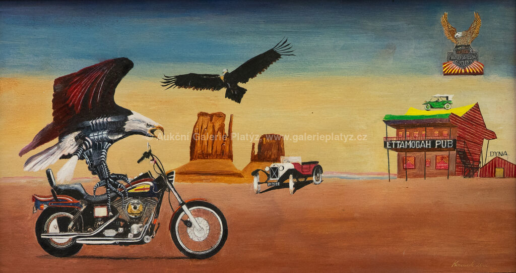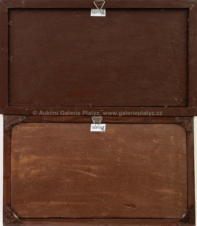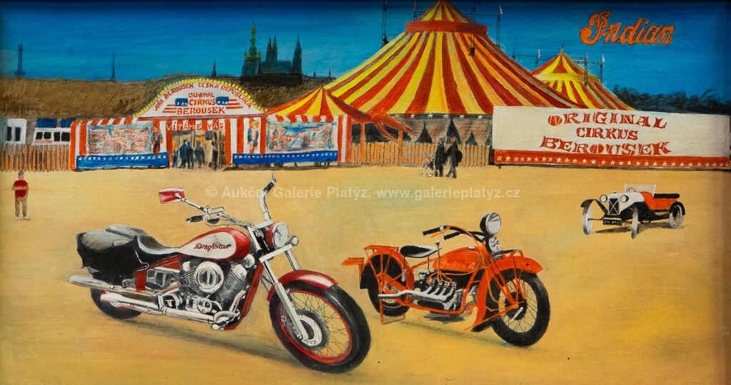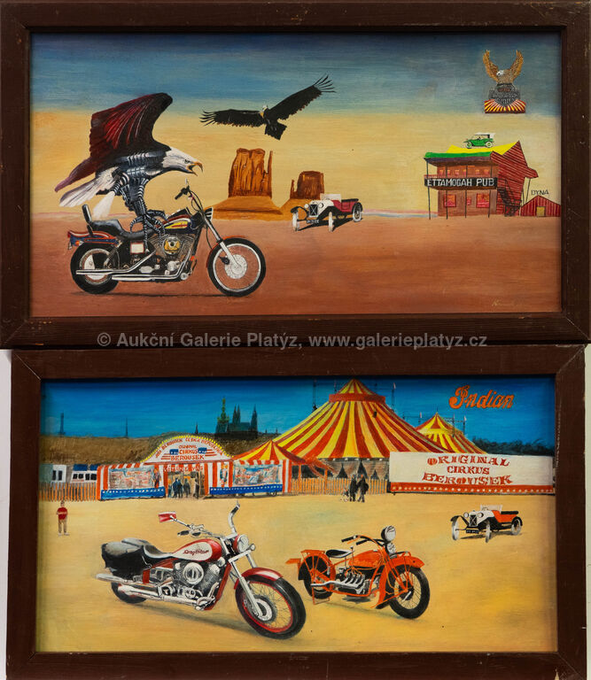 1) Harley-Davidson: olej/sololit, rozměr 24 x 43,5 cm, značeno a datováno vpravo dole, rámováno, oděrky na rámu, 2) Indian: olej/sololit, rozměr 23,5 x 42,5 cm, neznačeno, rámováno, oděrky na rámu