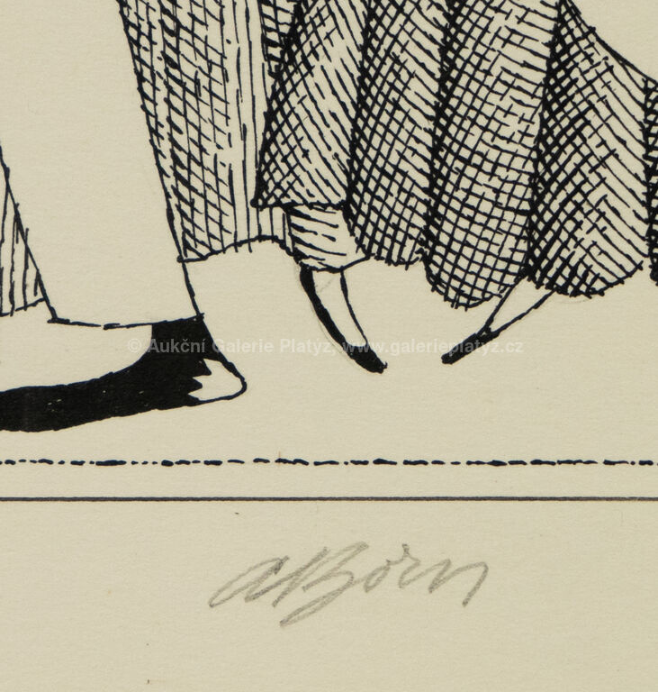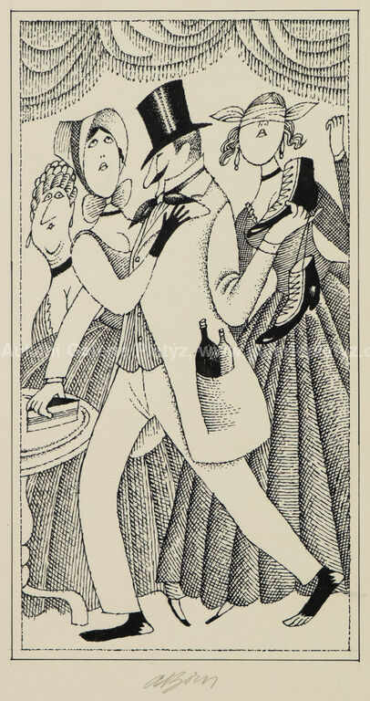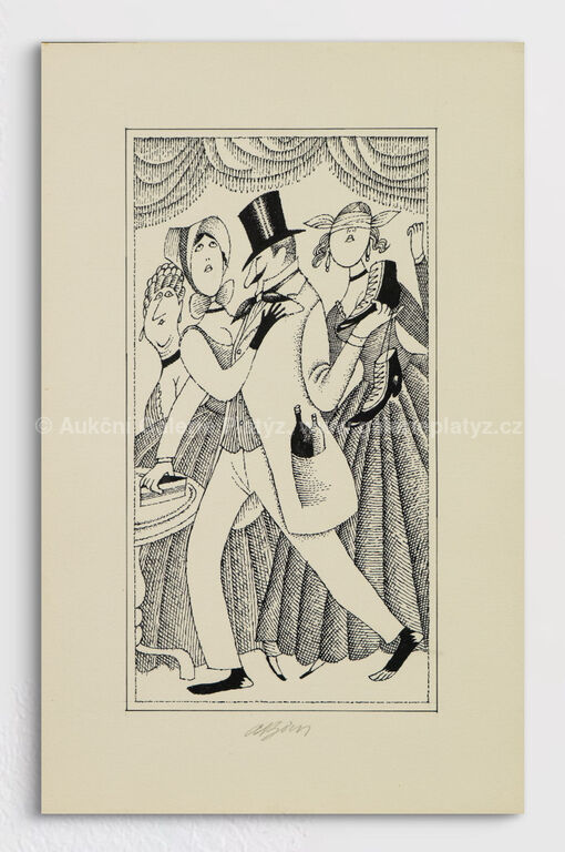tuš/papír, rozměr listu 25,5 x 16 cm, značeno ve spodní části, volně loženo, kresba - předloha pro litografie/ilustrace publikované v bibliofilském vydání knížečky Nejnovější český galanthomme čili Krásochovník (1985), naps. Václav Čeněk Bendl s použitím textů Jaroslava Haška k jeho 100. výročí narození.