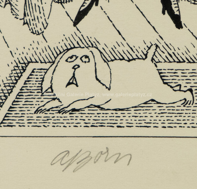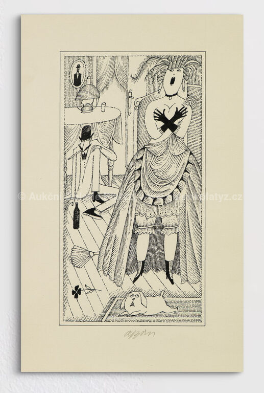 tuš/papír, rozměr listu 25,5 x 16 cm, značeno ve spodní části, volně loženo, kresba - předloha pro litografie/ilustrace publikované v bibliofilském vydání knížečky Nejnovější český galanthomme čili Krásochovník (1985), naps. Václav Čeněk Bendl s použitím textů Jaroslava Haška k jeho 100. výročí narození.