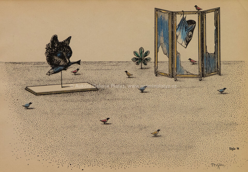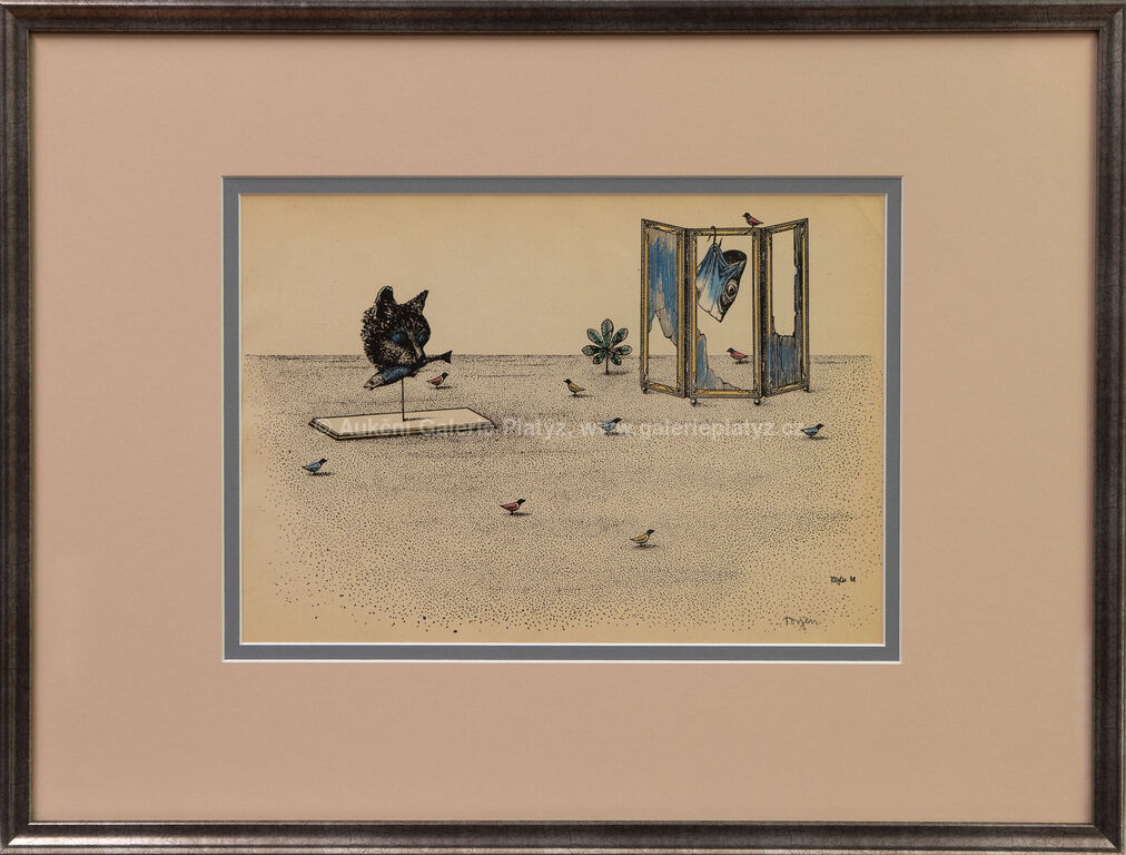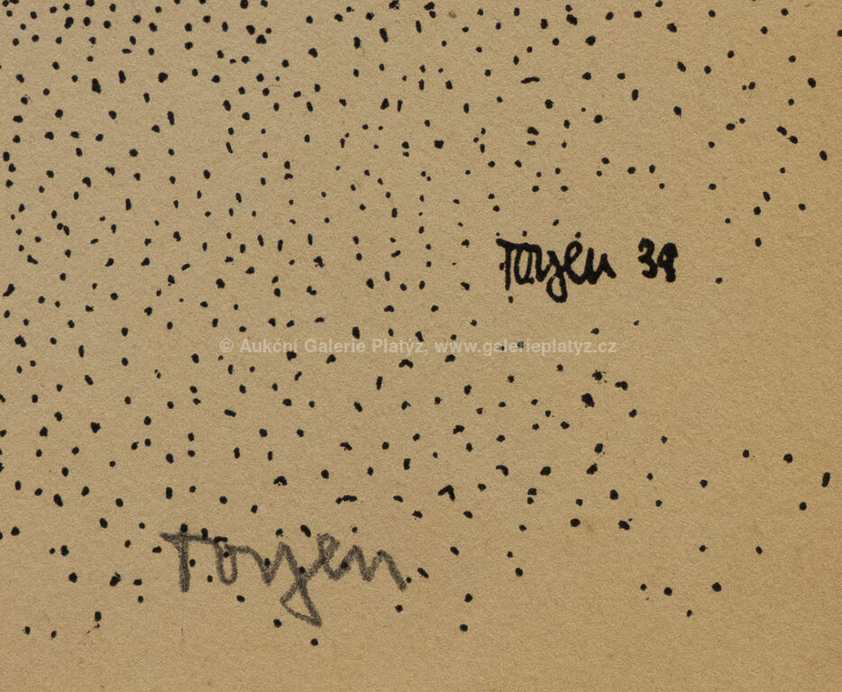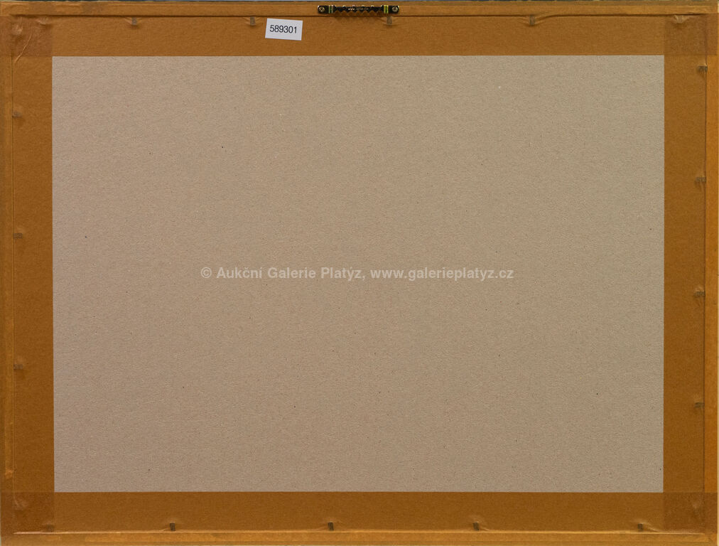 kolorovaná zinkografie/papír, rozměr ve výřezu 26,5 x 38 cm, značeno a datováno vpravo dole v tisku, vpravo dole tužkou, paspartováno, zaskleno, rámováno