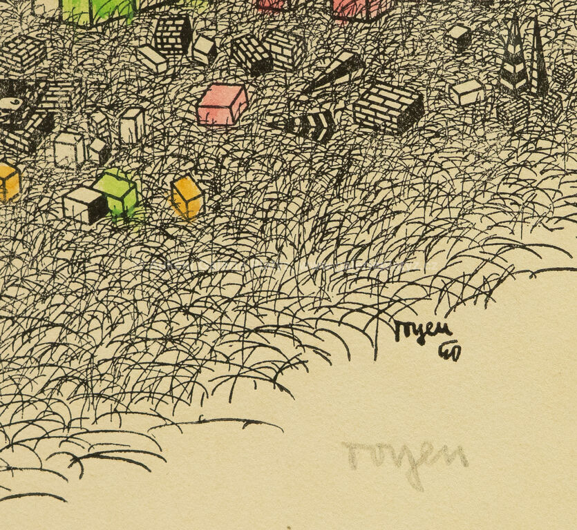 kolorovaná zinkografie/papír, rozměr ve výřezu 22 x 39,5 cm, značeno a datováno vpravo dole v tisku a vpravo dole tužkou, paspartováno, zaskleno, rámováno