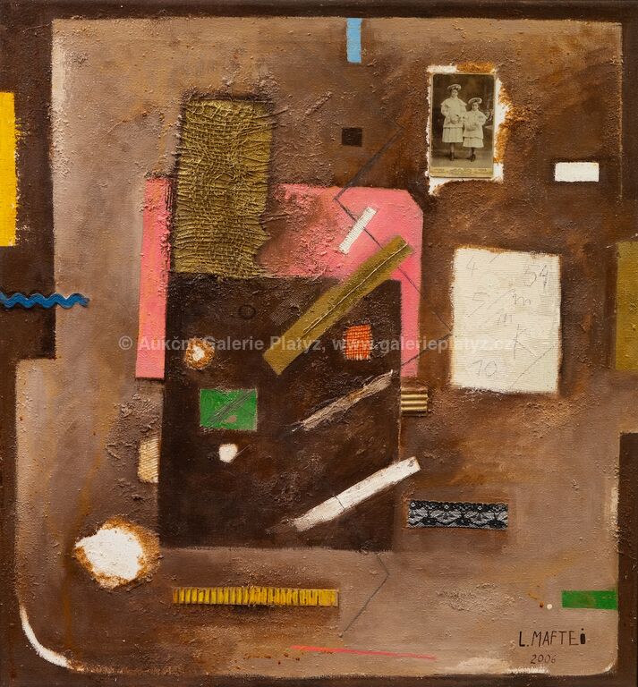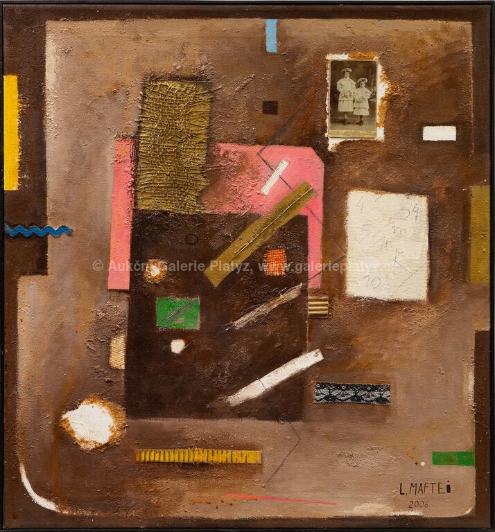 kombinovaná technika, koláž, strukturální malba/olej/plátno, rozměr 70 x 65 cm, značeno a datováno vpravo dole, olištováno