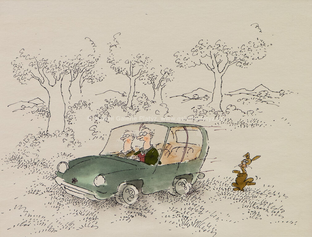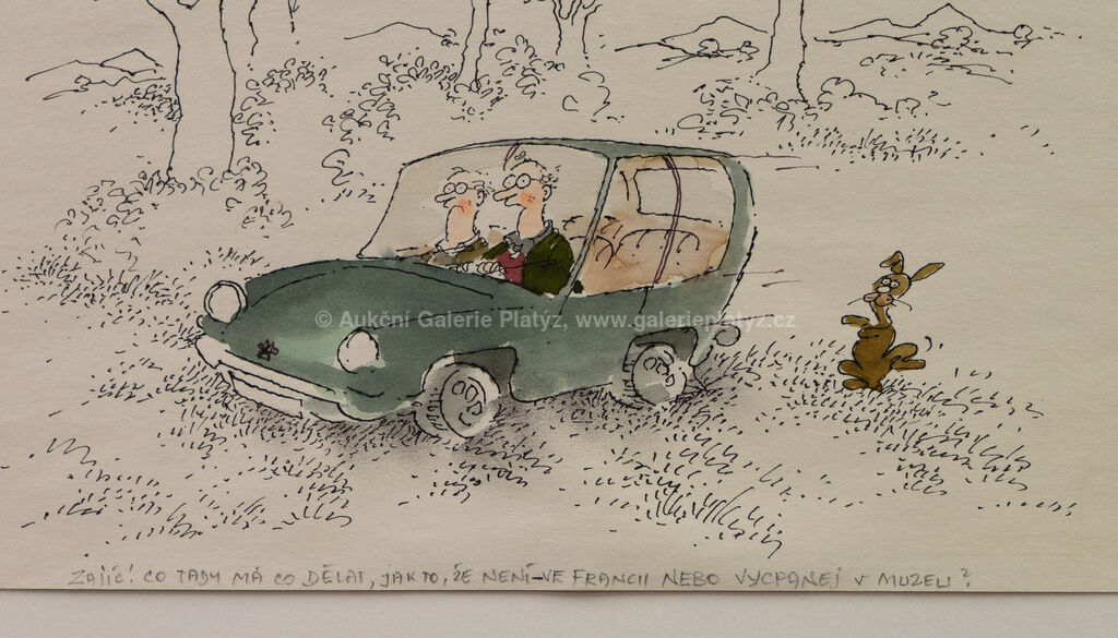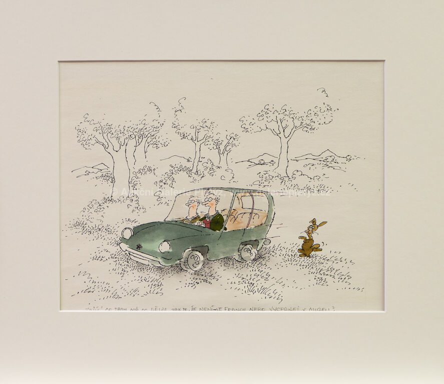 akvarel/tuš/papír, rozměr ve výřezu 20 x 26 cm, neznačeno, autorsky popsáno ve spodní části, paspartováno