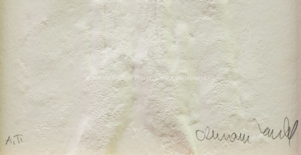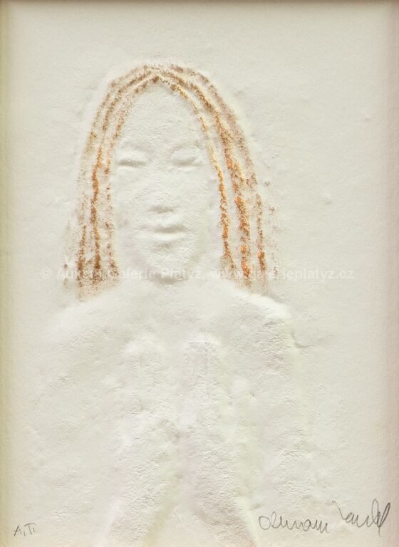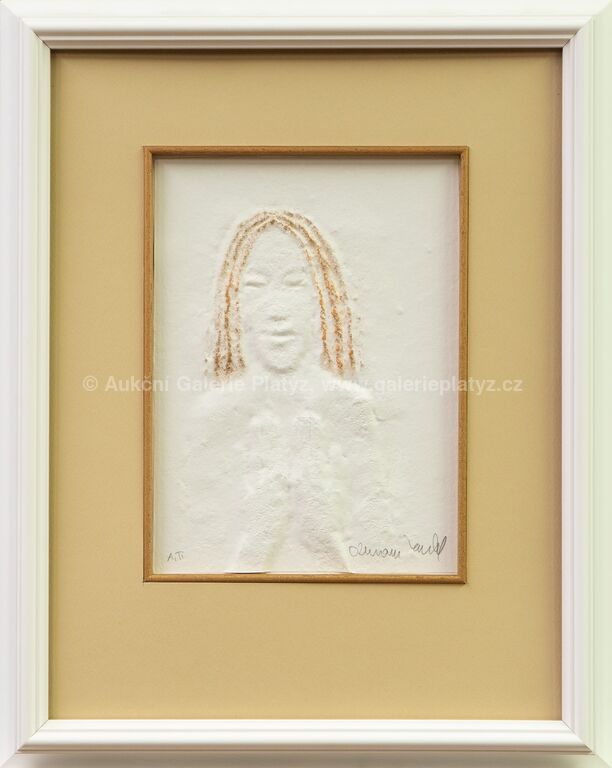 papírový reliéf/zlato/ruční papír, rozměr ve výřezu 20 x 14,5 cm, značeno a popsáno ve spodní části, paspartováno, zaskleno, rámováno, konzultováno a pravost potvrzena Nadačním fondem Kmentová Zoubek (vznik 2002)