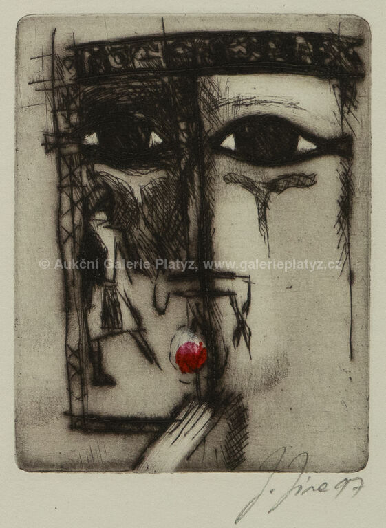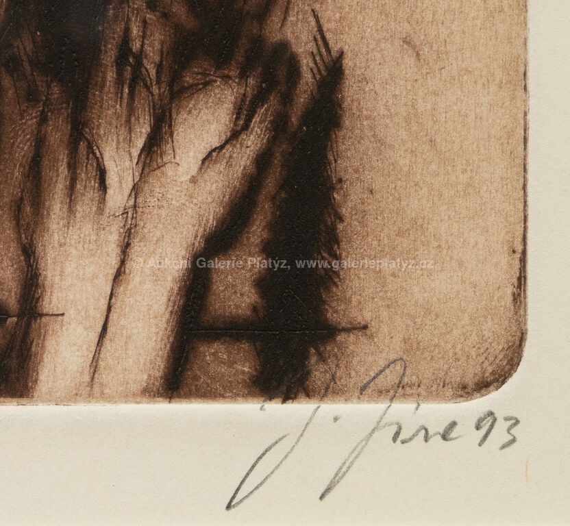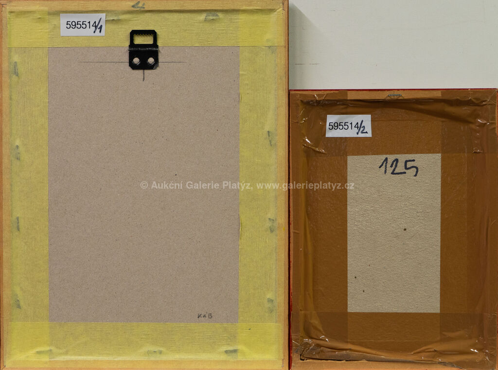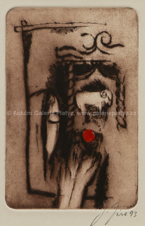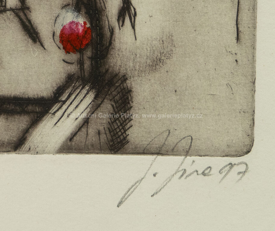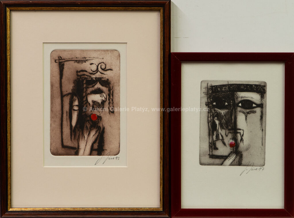 Beránek: kolorovaná suchá jehla/papír, rozměr ve výřezu 17 x 11,5 cm, značeno a datováno vpravo dole, paspartováno, zaskleno, rámováno, Za oknem: kolorovaná suchá jehla/papír, rozměr 21 x 15 cm, značeno a datováno vpravo dole, zaskleno, rámováno