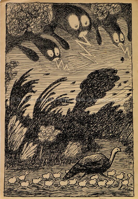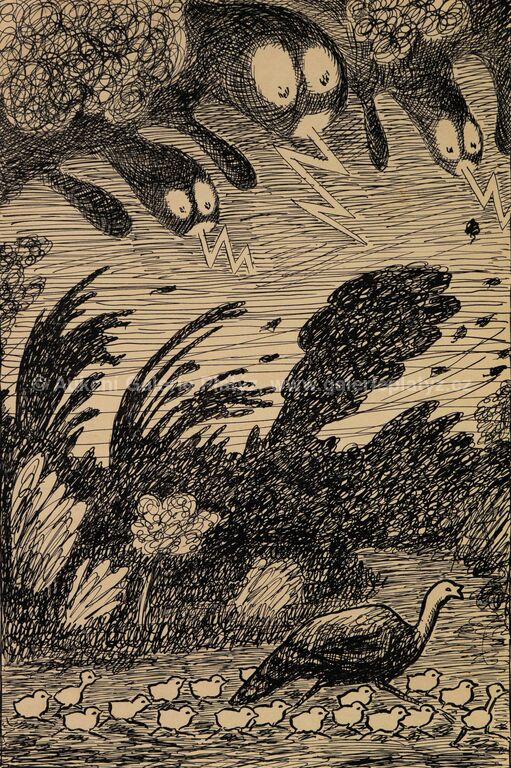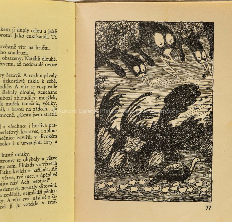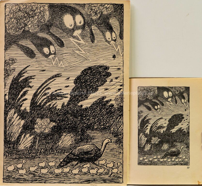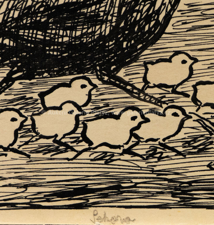 tuš/papír, rozměr listu 36 x 25 cm, značeno vpravo dole tužkou, volně loženo, ilustrace z knihy Karly Dolínkové Maminka Ťok Ťok a její děti (1929), kniha přiložena