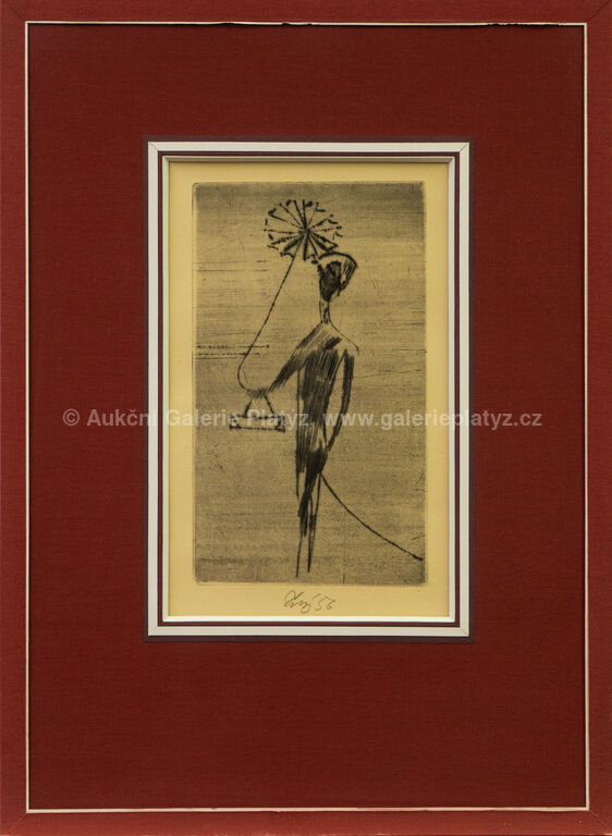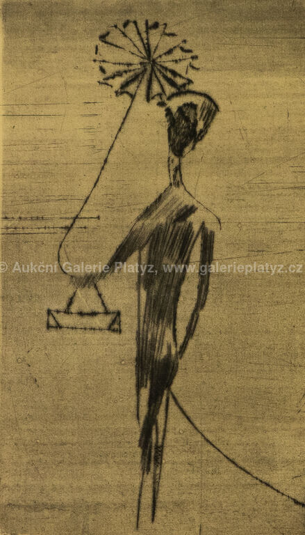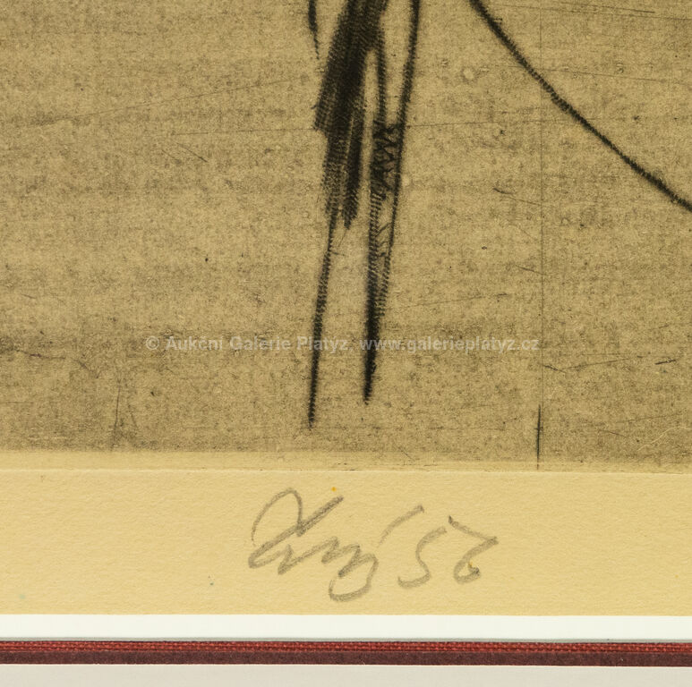 suchá jehla/papír, rozměr ve výřezu 25 x 15,5 cm, značeno a datováno ve spodní části, paspartováno, zaskleno, nerámováno, uvedeno v soupisu graf. díla Fr. Tichého pod číslem 277, str. 169, Vytvořeno jako příloha katalogu autorovy výstavy v Hollaru. Mimo zkušební dva tisky pořízeno k zahájení výstavy 10 otisků.