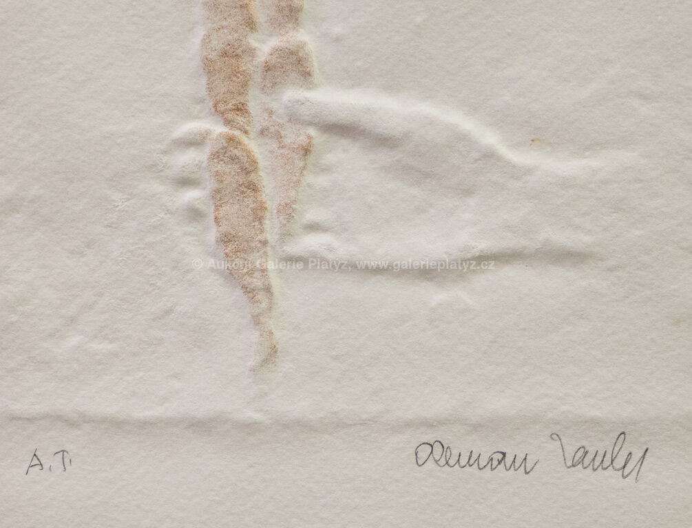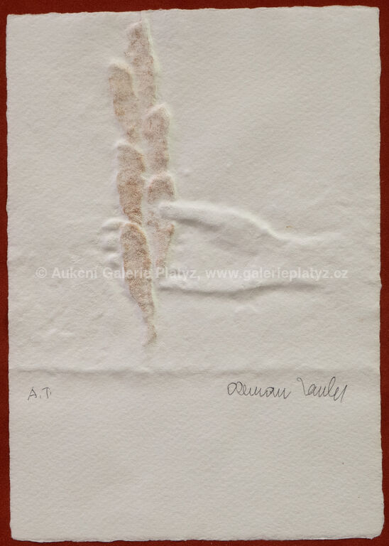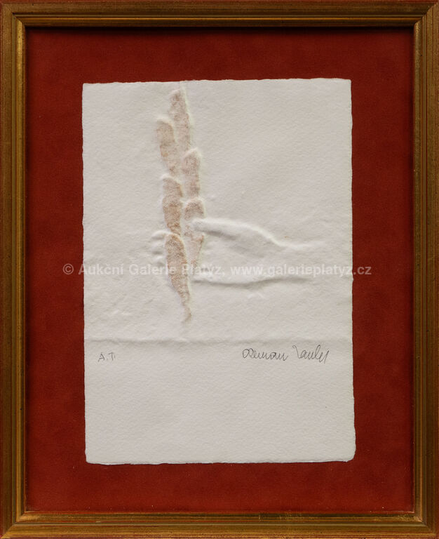 papírový reliéf/ruční papír/zlato, rozměr listu 21,5 x 15 cm, značeno a popsáno ve spodní části, zaskleno, rámováno, vznik 1989, konzultováno a pravost potvrzena Nadačním fondem Kmentová Zoubek