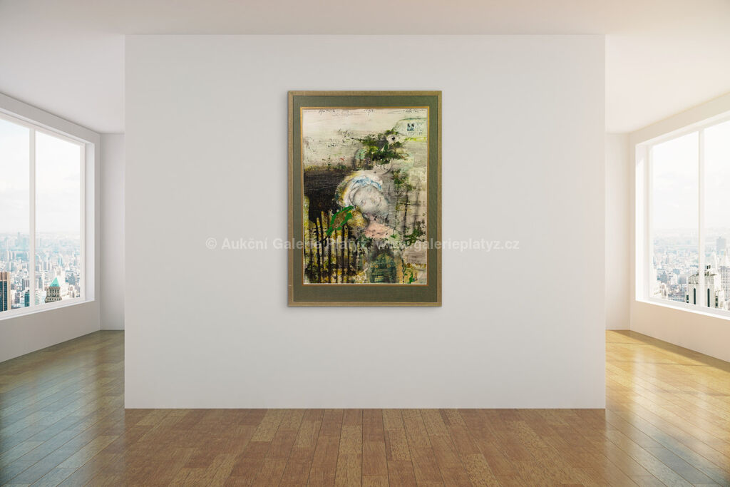 kombinovaná technika/papír, rozměr ve výřezu 97 x 68 cm (VELKÝ FORMÁT), značeno, datováno a popsáno v horní části, paspartováno, zaskleno, součást scénografického návrhu k opeře B. Martinů a G. Neveuxe Julietta (aneb snář)