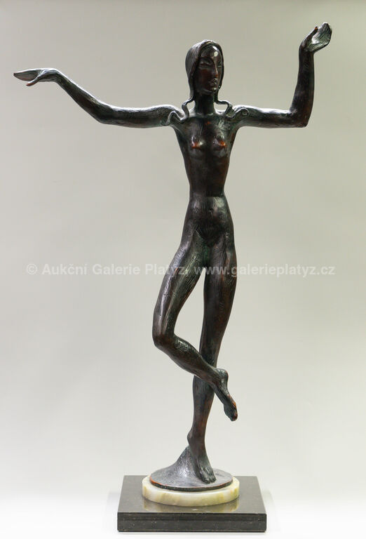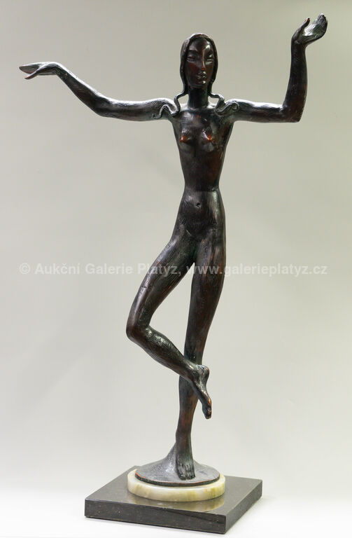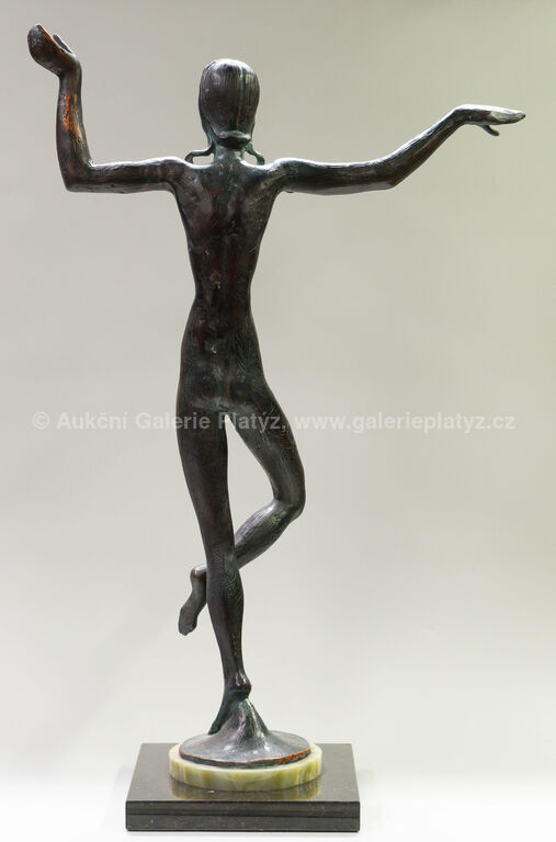 bronzová plastika, patinovaný bronz na mramorovém podstavci, celková výška 76 cm, rozměr plastiky 72 x 50 cm, značeno na plintu, pozdější odlitek