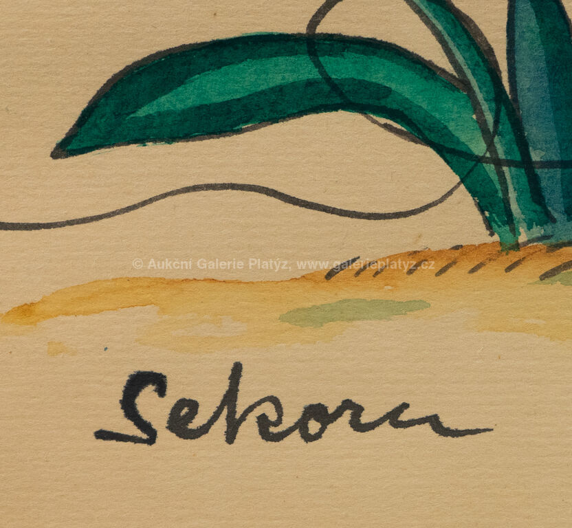 akvarel/tuš/papír, rozměr ve výřezu 29 x 41,5 cm, značeno vlevo dole, paspartováno, zaskleno, rámováno, oděrky na rámu