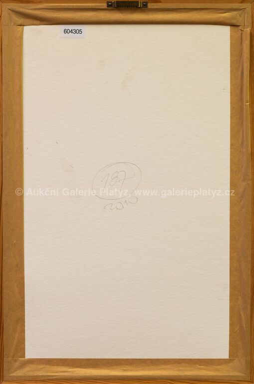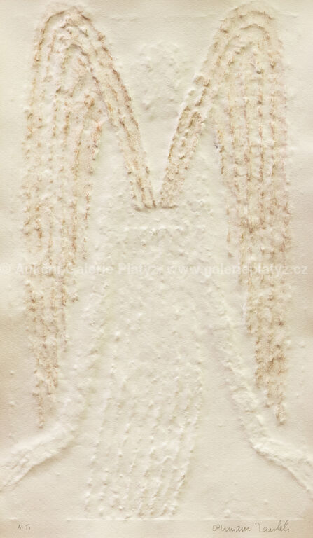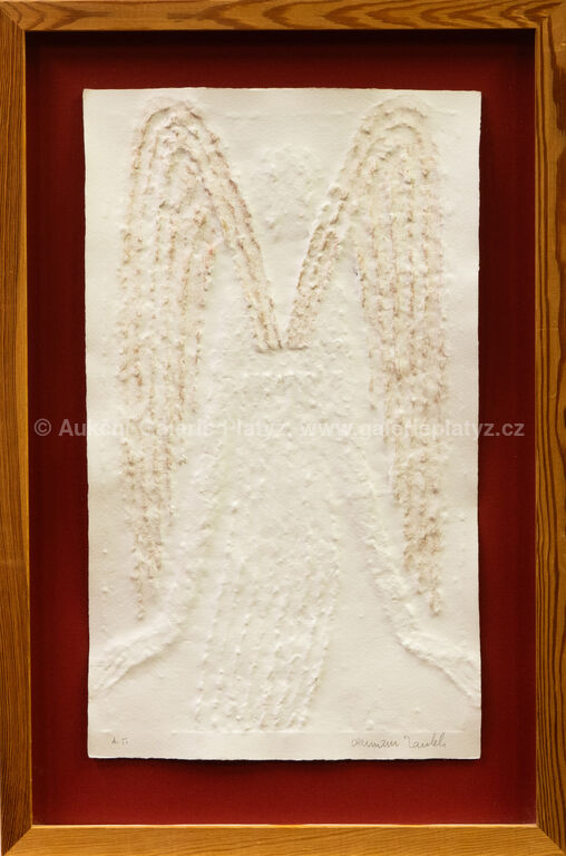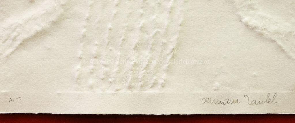 papírový reliéf/ruční papír/zlato, rozměr listu 42 x 24,5 cm, značeno a popsáno ve spodní části, zaskleno, rámováno, vznik 2005, konzultováno a pravost potvrzena Nadačním fondem Kmentová Zoubek
