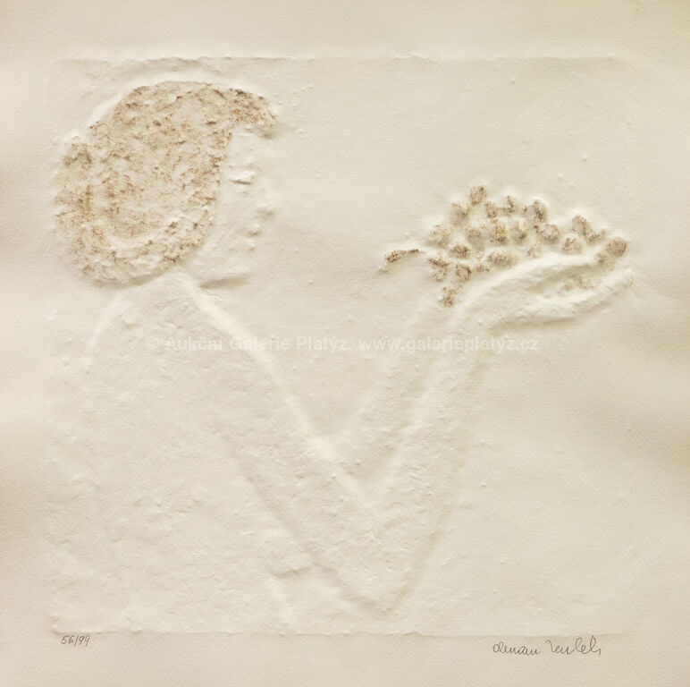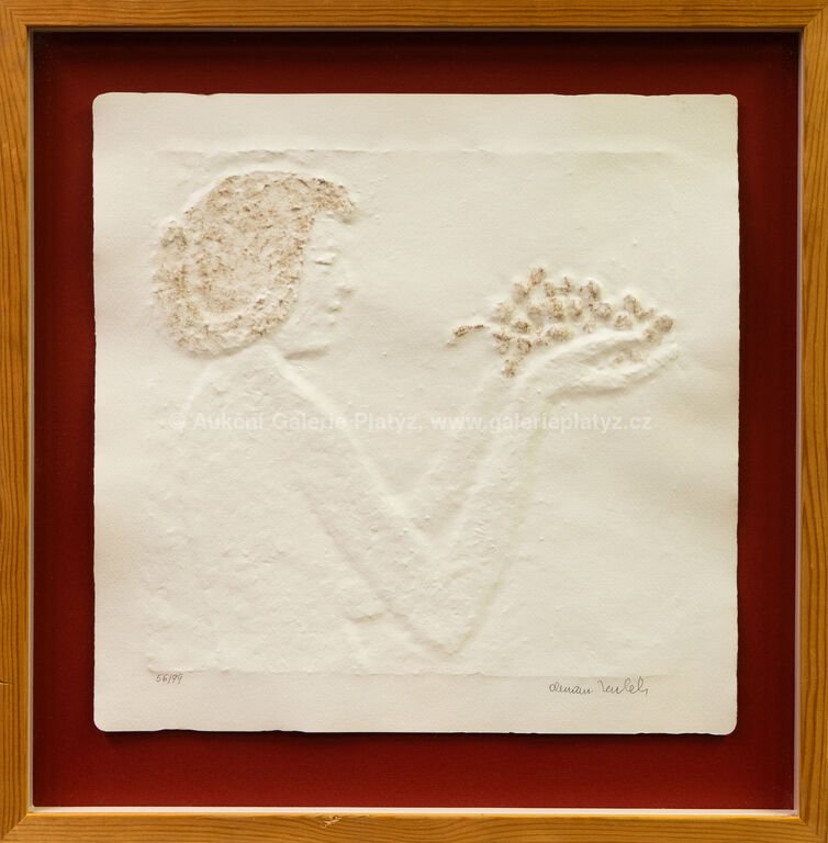papírový reliéf/ruční papír/zlato, rozměr listu 42 x 42 cm (VĚTŠÍ FORMÁT), značeno a číslováno ve spodní části, zaskleno, rámováno, vznik 2009, konzultováno a pravost potvrzena Nadačním fondem Kmentová Zoubek