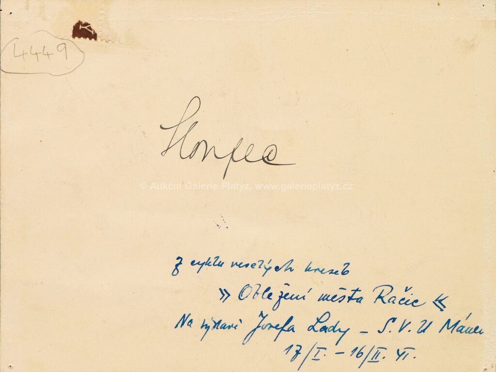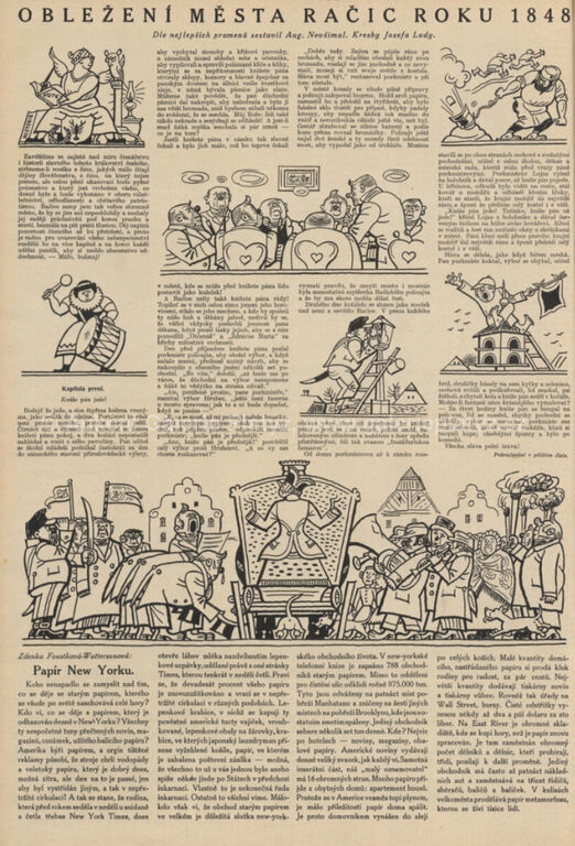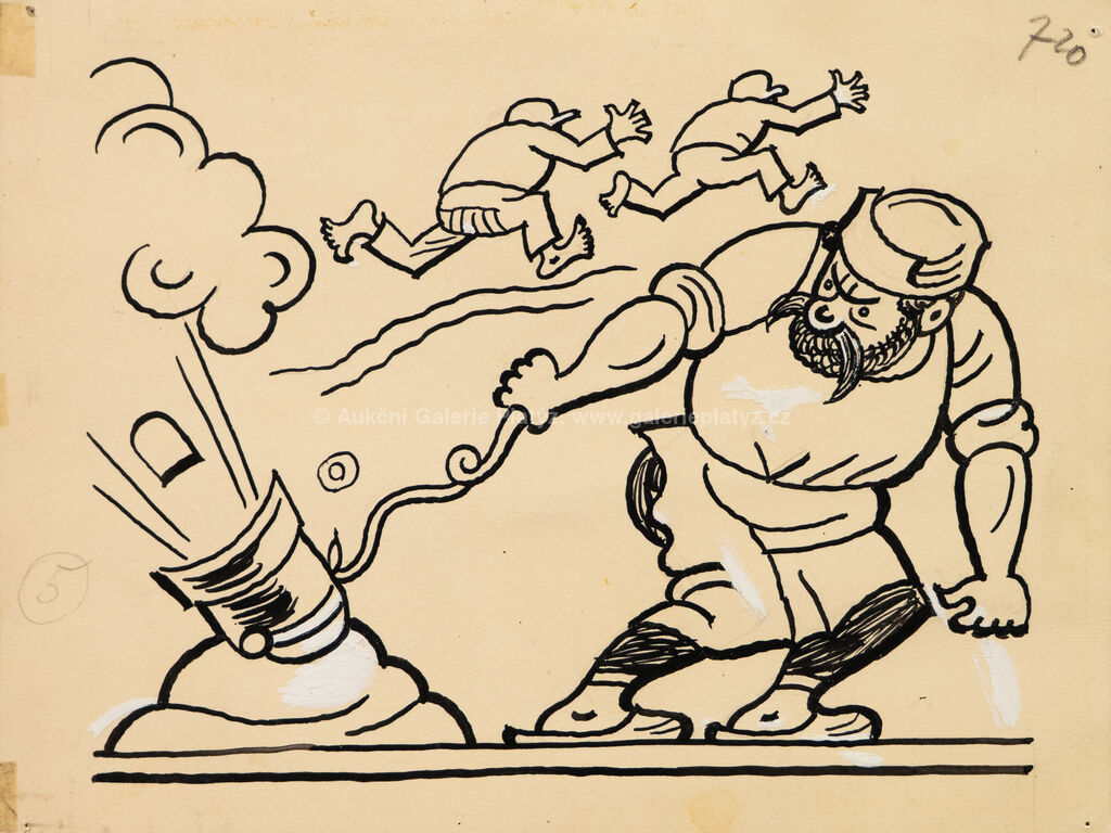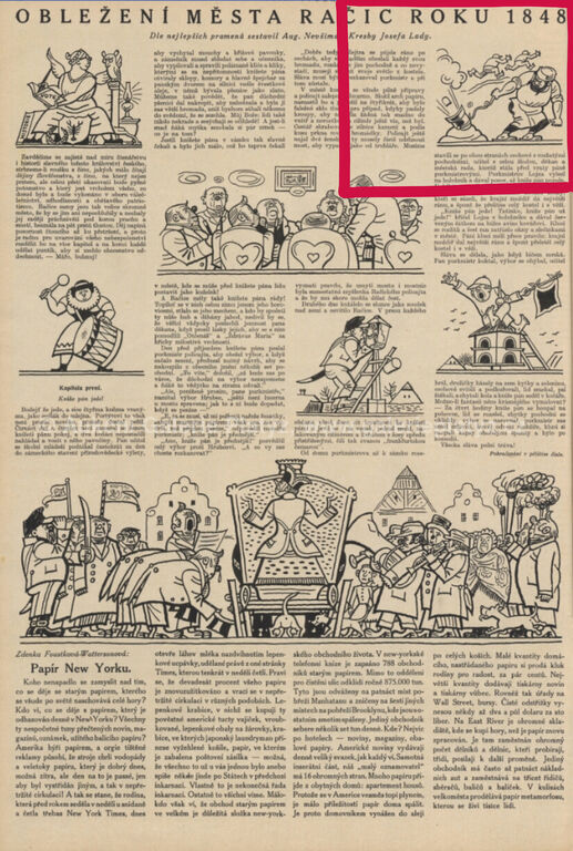 tuš/běloba/papír, rozměr listu 12,5 x 16,5 cm, neznačeno, popsáno na zadní straně, volně loženo, publikováno v časopise Pestrý týden, roč. 2, č. 41 (15.10.1927)