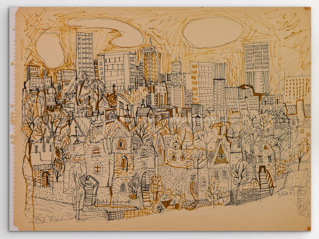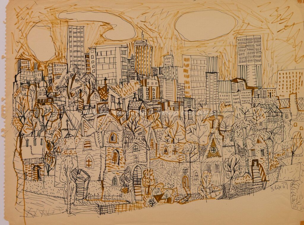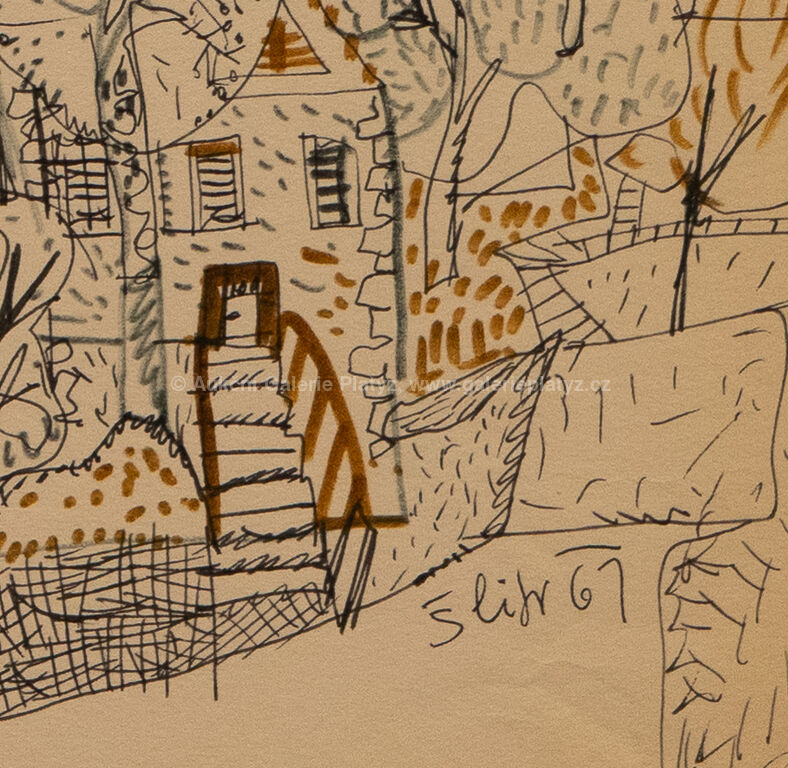 sépie/tuš/papír, rozměr listu 37,5 x 49,5 cm, značeno a datováno vpravo dole, volně loženo
