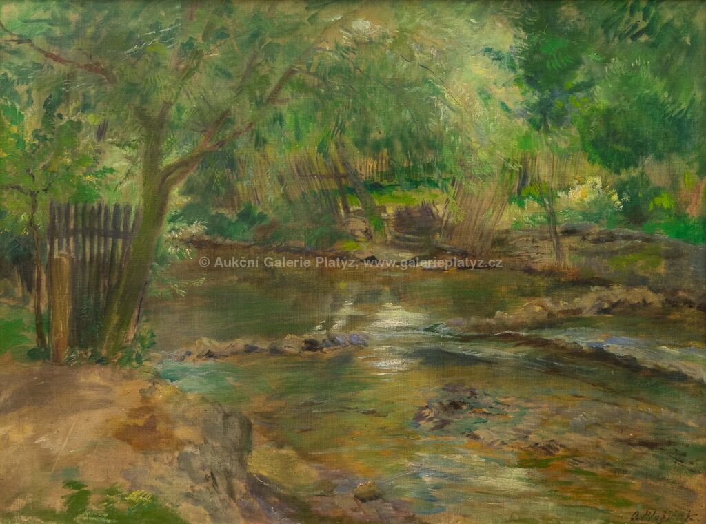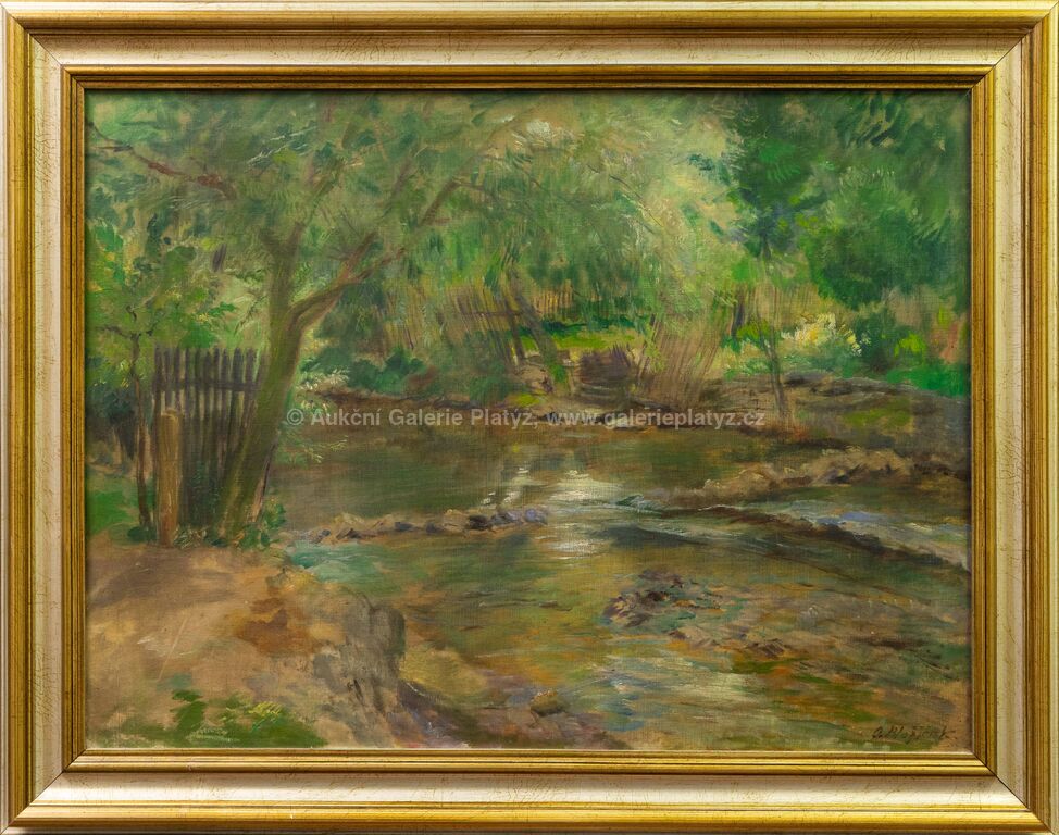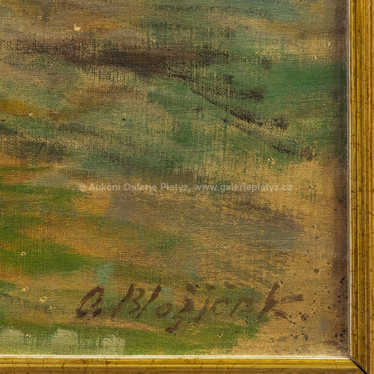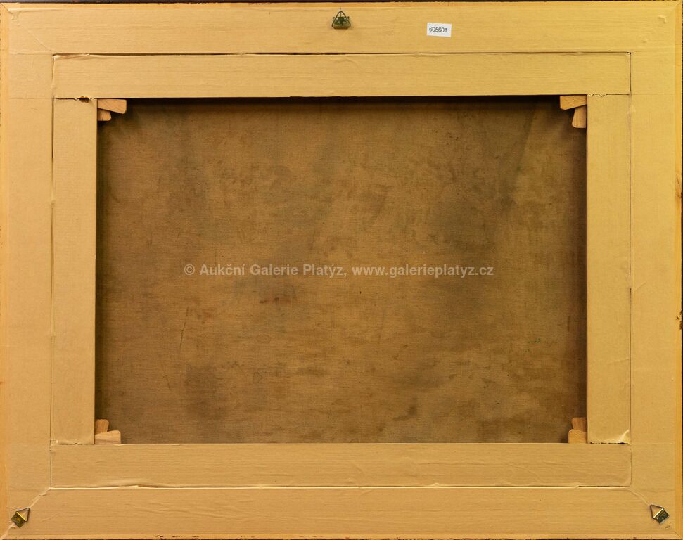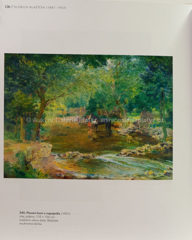 olej/plátno, rozměr 60 x 80 cm, značeno vpravo dole, rámováno, varianta obrazu Plavení koní u napajedla publikovaného v autorově monografii pod č. 240 na str. 126