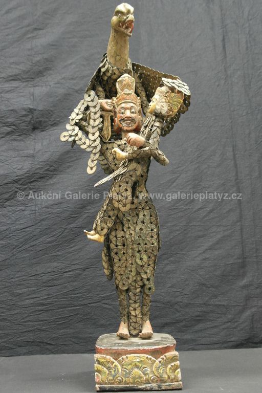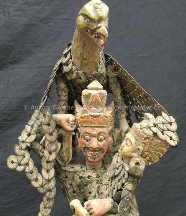 socha složená z mincí, malované dřevo, původ Asie, výška celková 77 cm, lokální oděrky, poškozené mince, původní stav