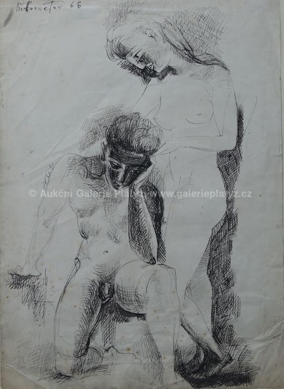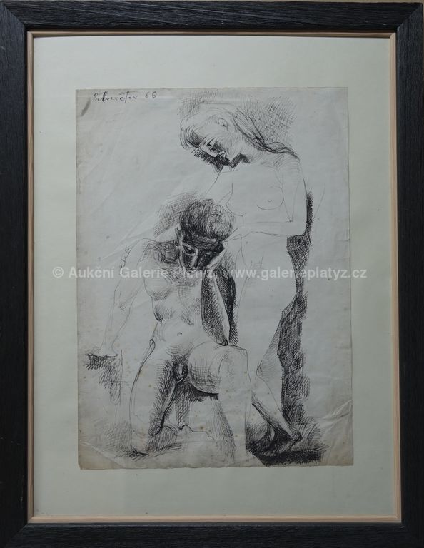 kresba tuší/papír, velikost listu 63 x 45 cm, signováno vlevo nahoře, datováno 66, papír poškozen hnědými tečkami, lokálně pomačkán, zaskleno, oděrky na rámu
