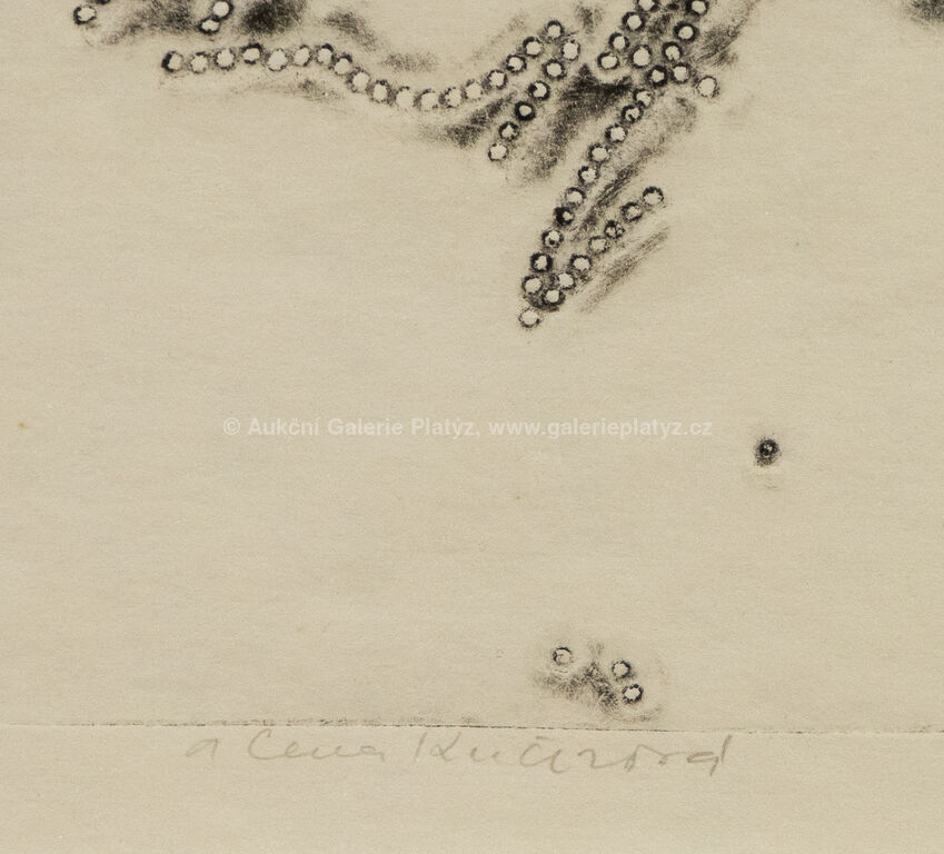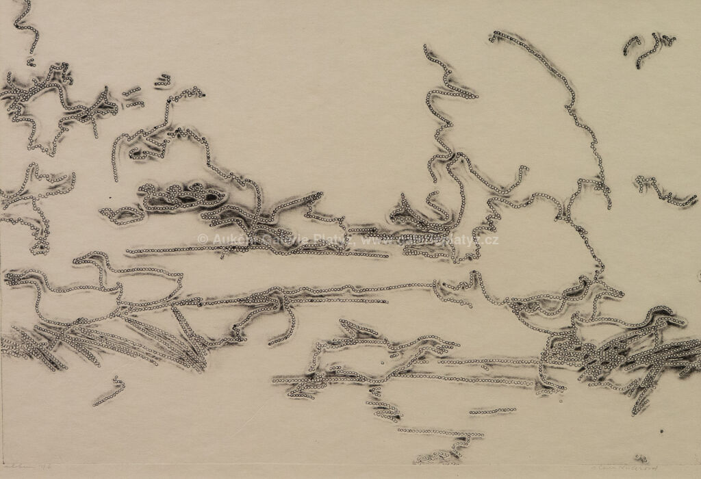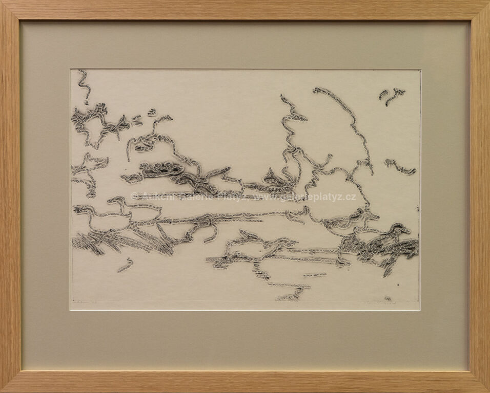 tisk z perforovaného a ohýbaného plechu/papír, rozměr listu 34 x 49 cm, značeno, datováno a popsáno ve spodní části, paspartováno, zaskleno, rámováno