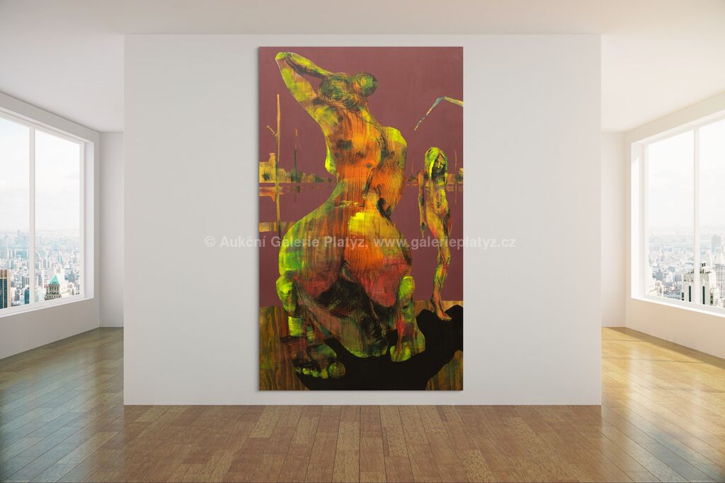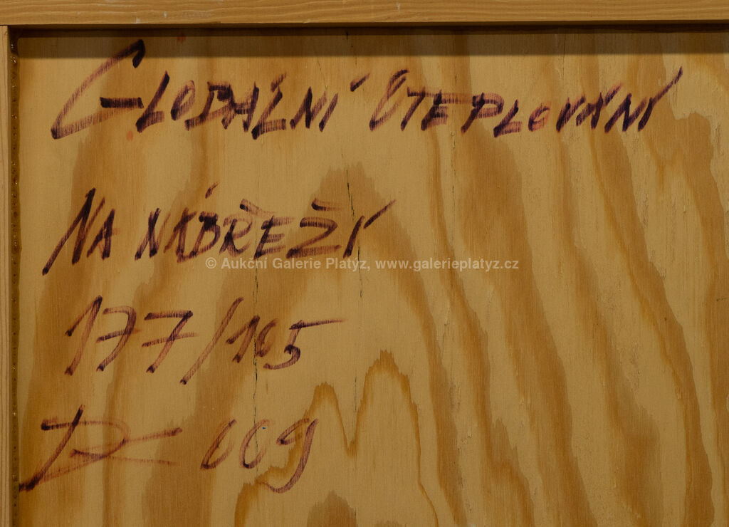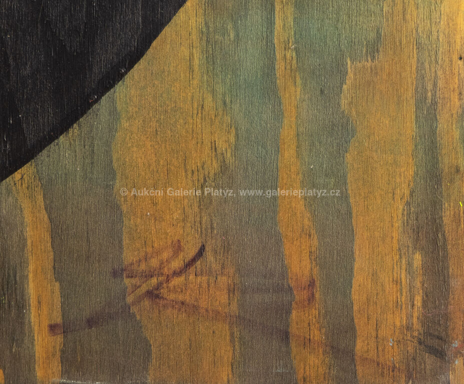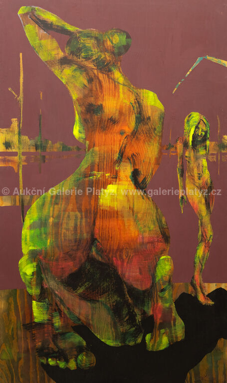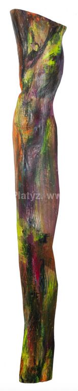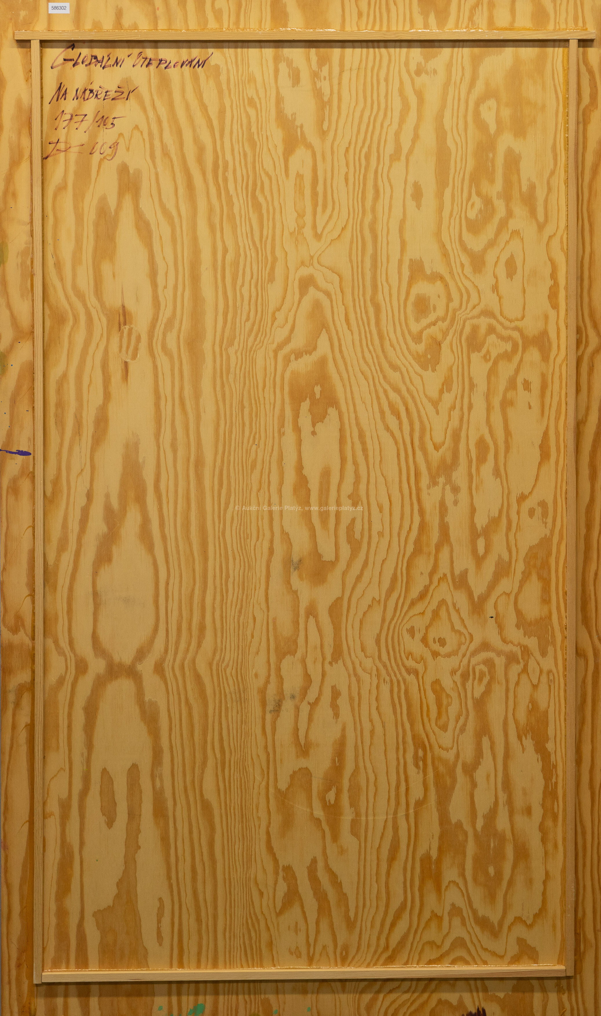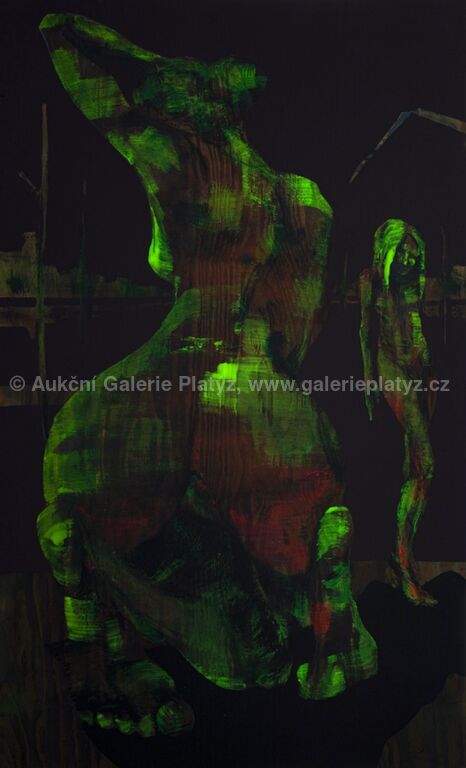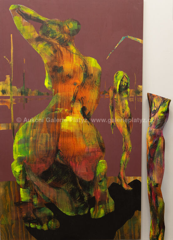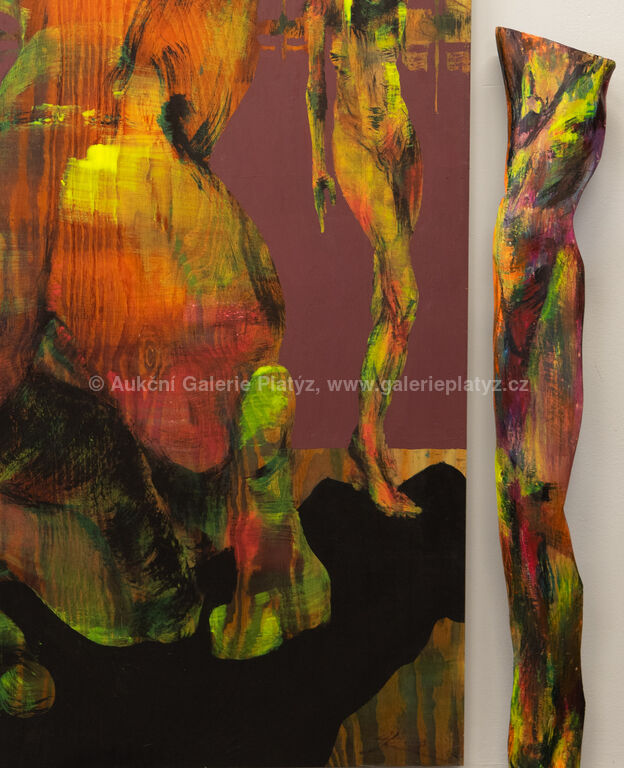 Malba: kombinovaná technika, luminiscenční barvy/překližka, rozměr 177 x 105 cm, značeno vpravo dole, značeno datováno a popsáno na zadní straně, nerámováno, Dřevěná plastika: výška cca 110 cm, rozměr 15 x 10 cm