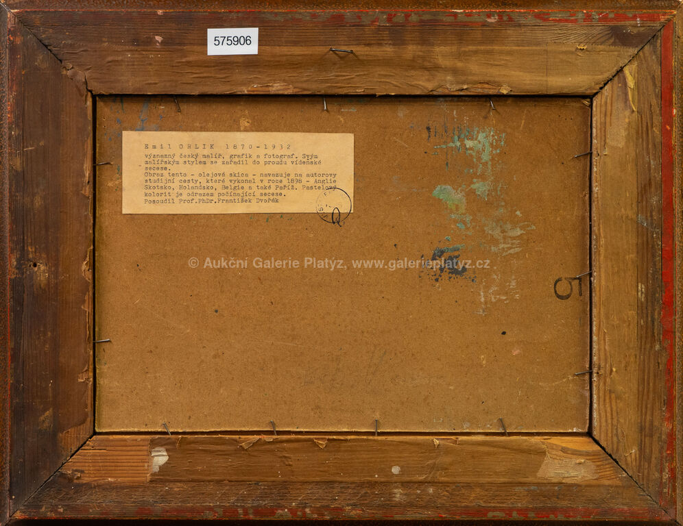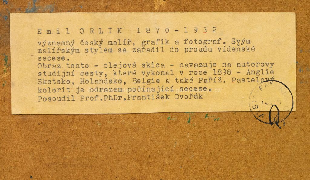 olej/karton, rozměr 23 x 33,5 cm, značeno vpravo dole, rámováno, oděrky na rámu, na zadní straně posouzení prof. Fr. Dvořáka