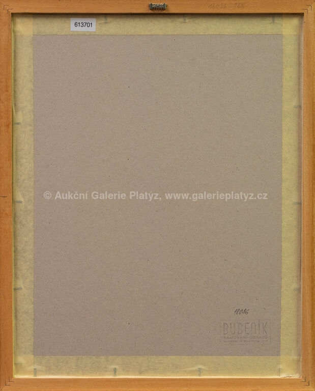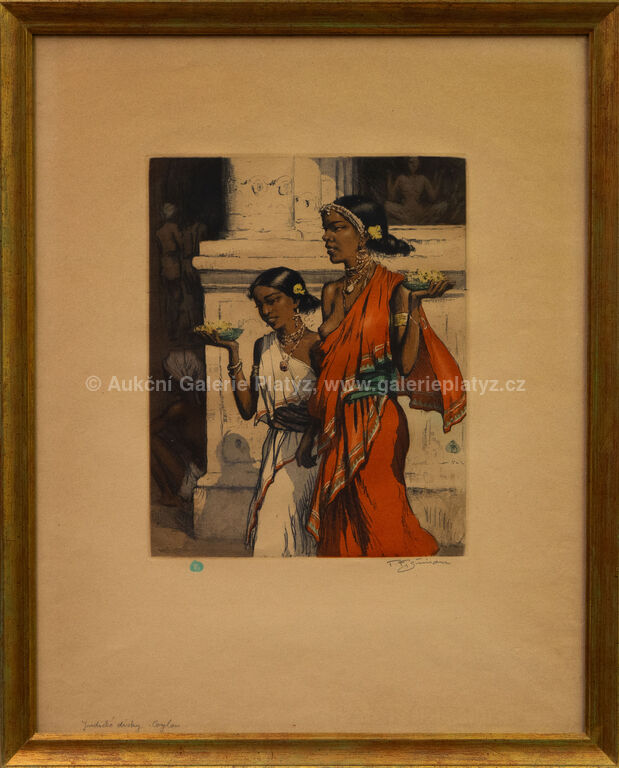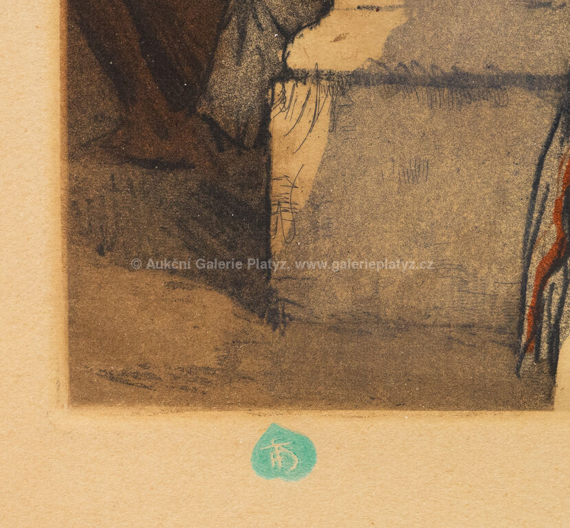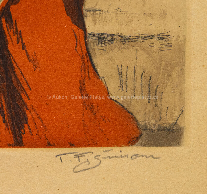 kolorovaná suchá jehla/papír, rozměr 50 x 40 cm, značeno vpravo dole, autorská pečeť vlevo dole, zaskleno, rámováno, uvedeno v soupisu autorova díla The Graphic Work of T. F. Šimon pod č. 280
