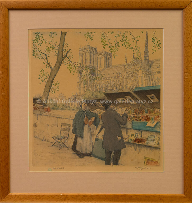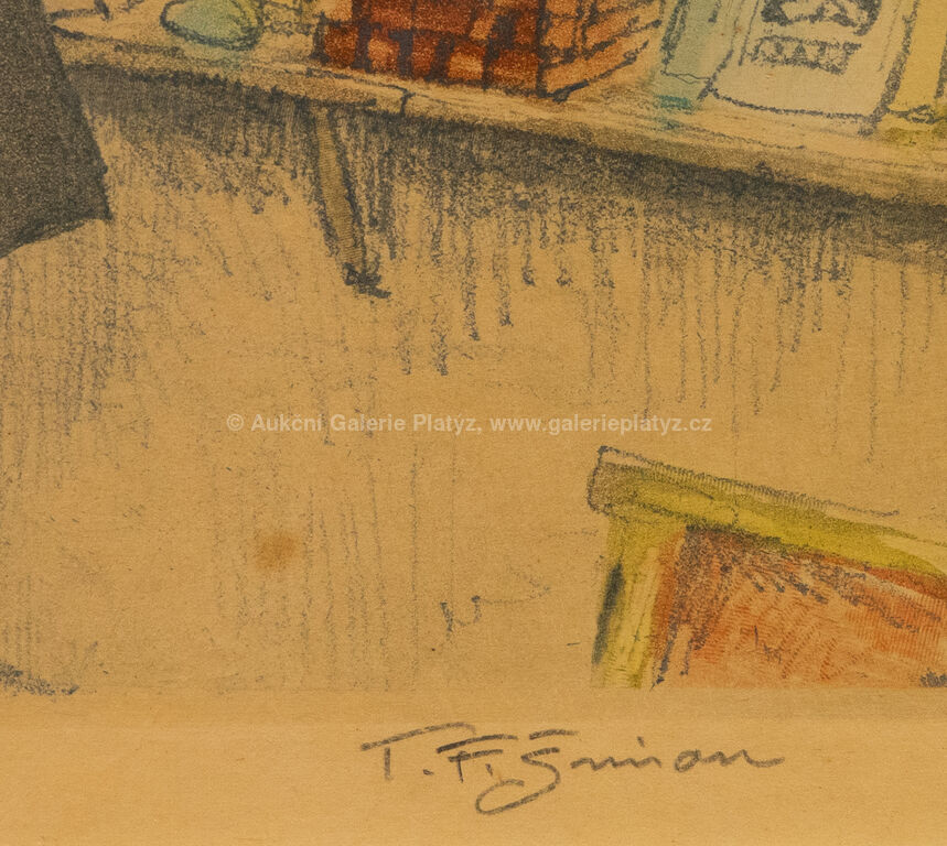 barevný lept/papír, rozměr ve výřezu 36 x 34 cm, značeno vpravo dole, autorská pečeť vlevo dole, paspartováno, zaskleno, rámováno, uvedeno v soupisu autorova díla The Graphic Work of T. F. Šimon pod č. 236