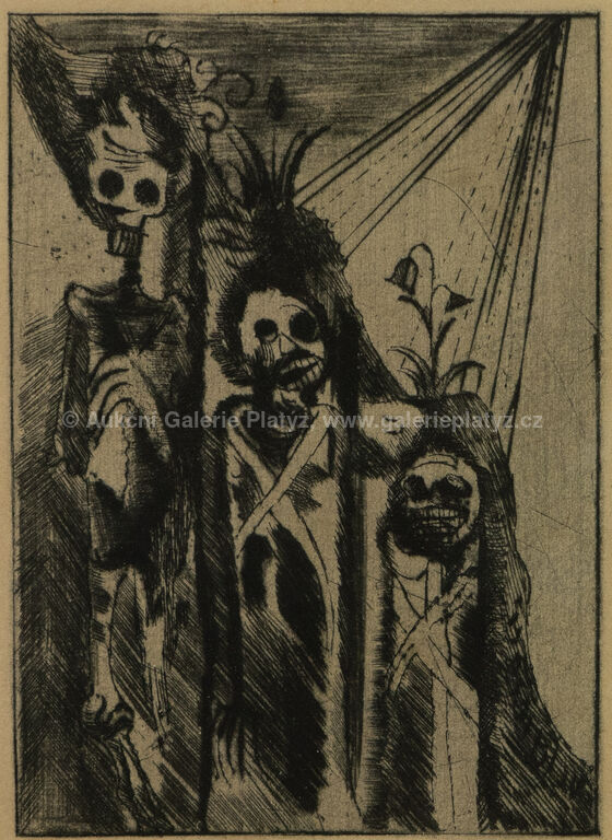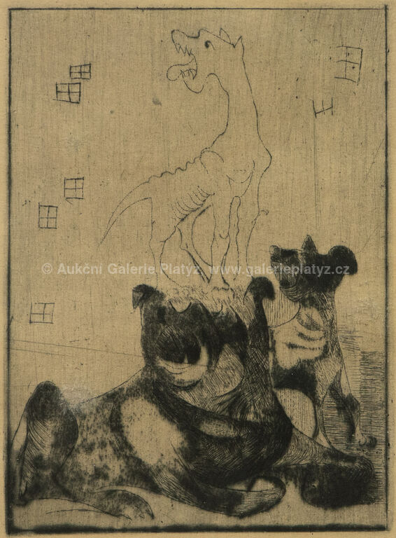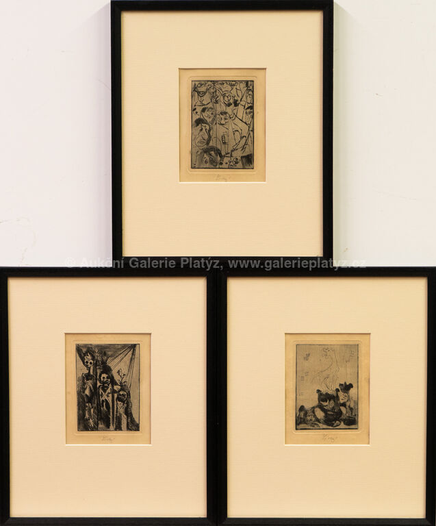 obr. 1, Hlavy Geuzů: suchá jehla/papír, rozměr ve výřezu 13 x 10 cm, značeno ve spodní části, paspartováno, zaskleno, rámováno, obr. 2, Tři kostlivci: suchá jehla/papír, rozměr ve výřezu 13 x 10 cm, značeno ve spodní části, paspartováno, zaskleno, rámováno obr. 3, Tři psi: suchá jehla/papír, rozměr ve výřezu 13 x 10 cm, značeno ve spodní části, paspartováno, zaskleno, rámováno