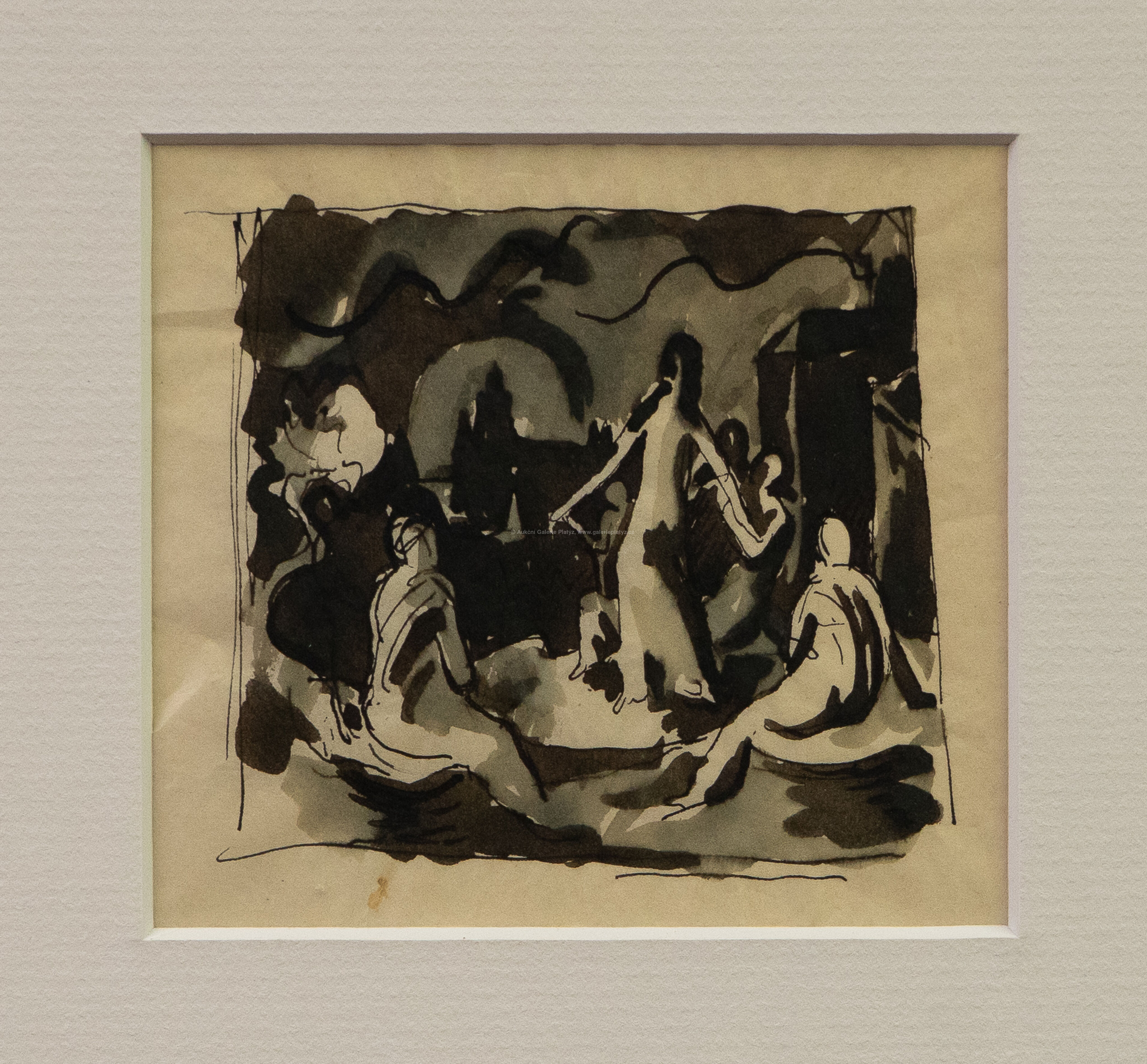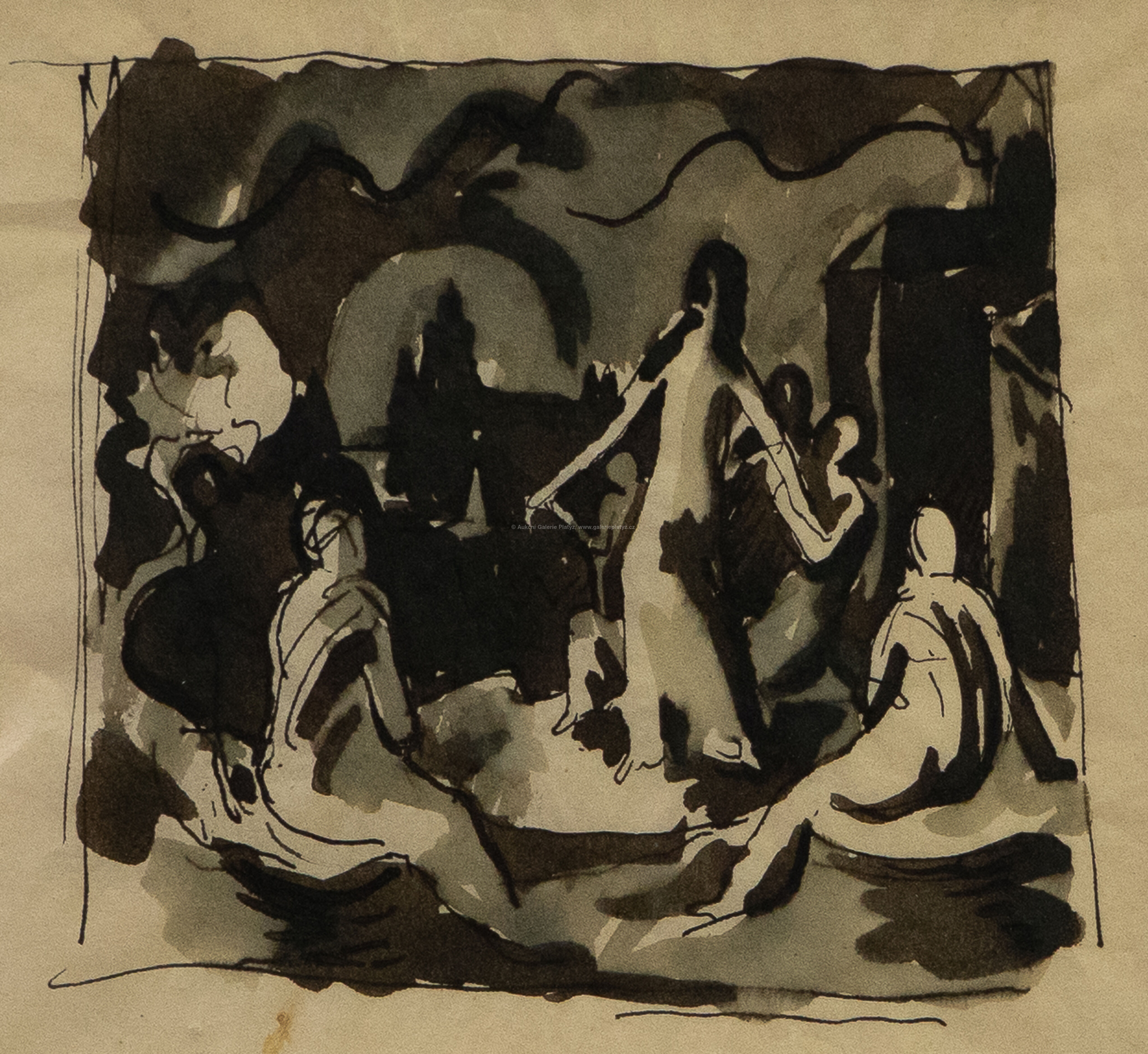 lavírovaná tuš/papír, rozměr ve výřezu 8,5 x 9 cm, neznačeno, paspartováno, z pozůstalosti blízké přítelkyně Jana Zrzavého, paní Ely Kadlecové