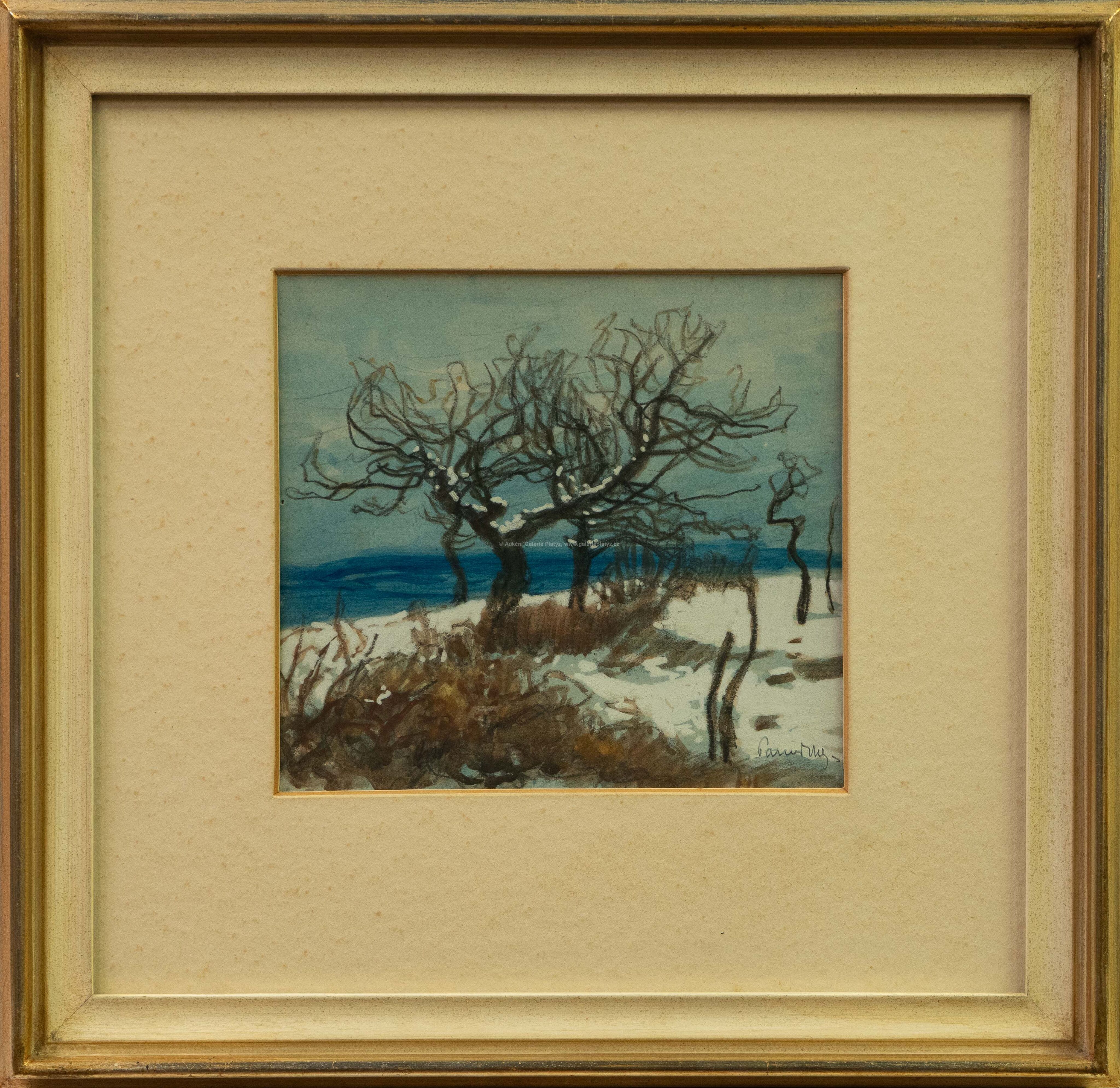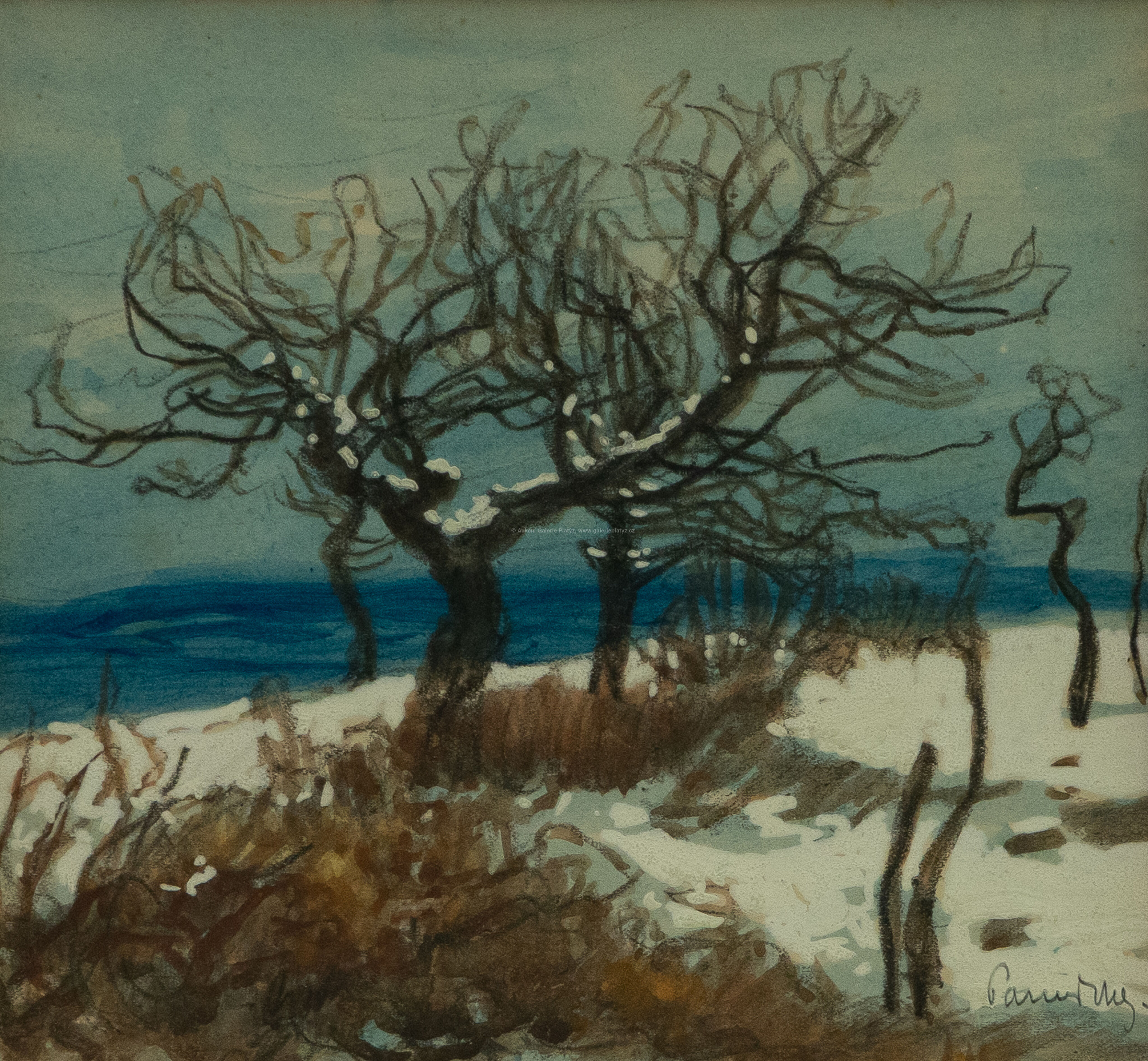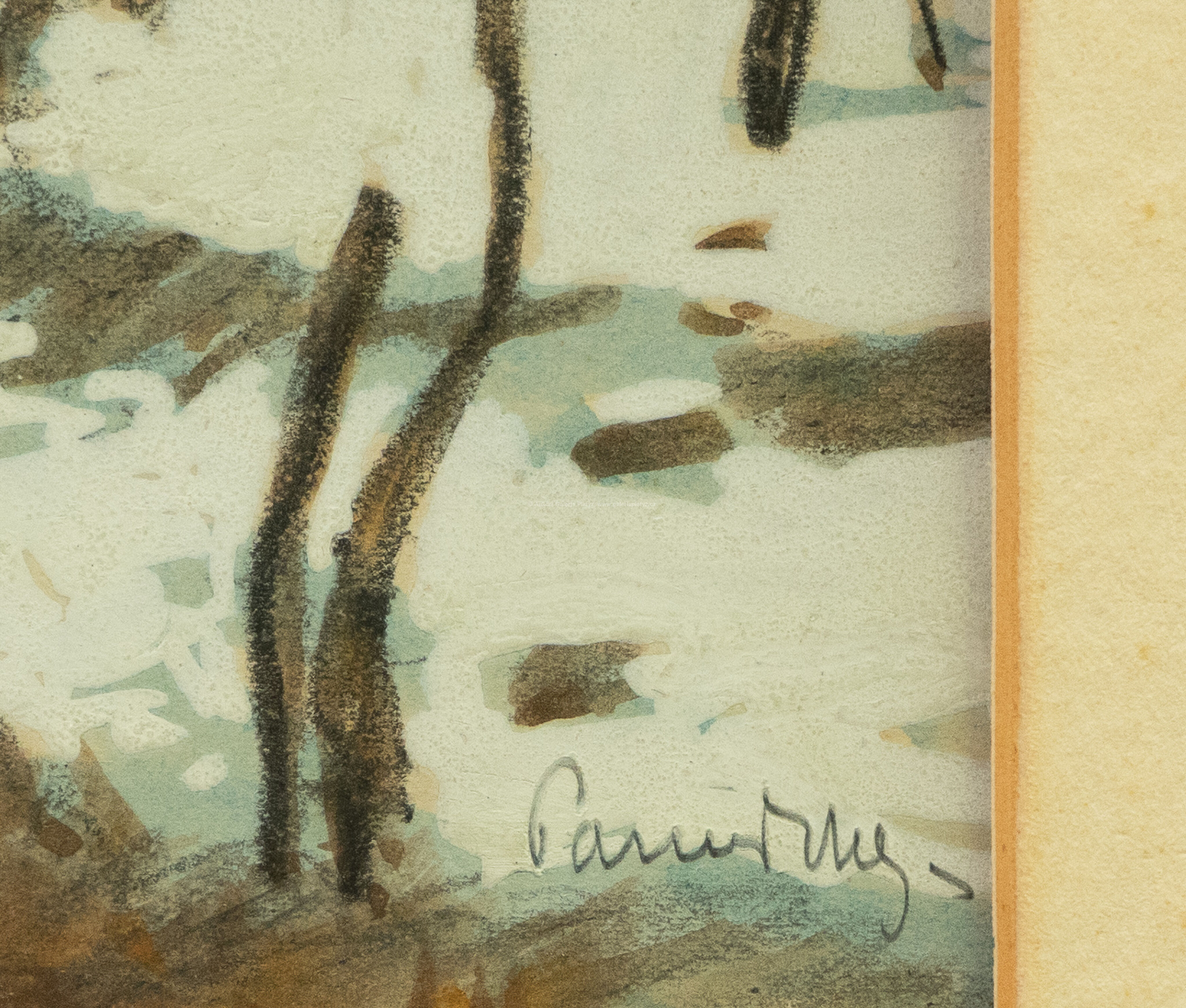 kombinovaná technika, tempera/pastel/karton, rozměr ve výřezu 16 x 18 cm, značeno vpravo dole, paspartováno, zaskleno, rámováno