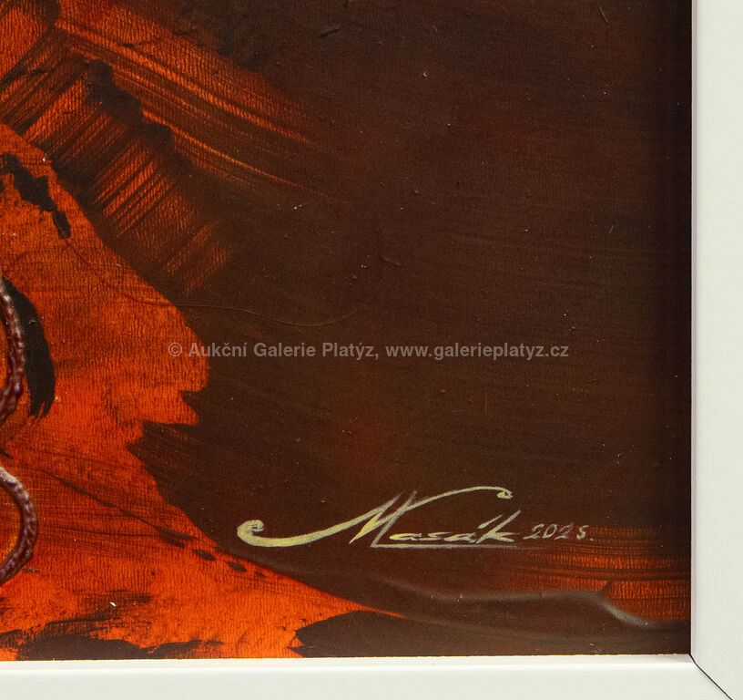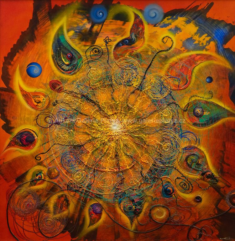 kombinovaná technika, strukturální malba, olej/akryl/sololit, rozměr 100 x 98 cm, značeno a datováno vpravo dole, rámováno