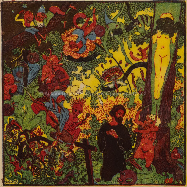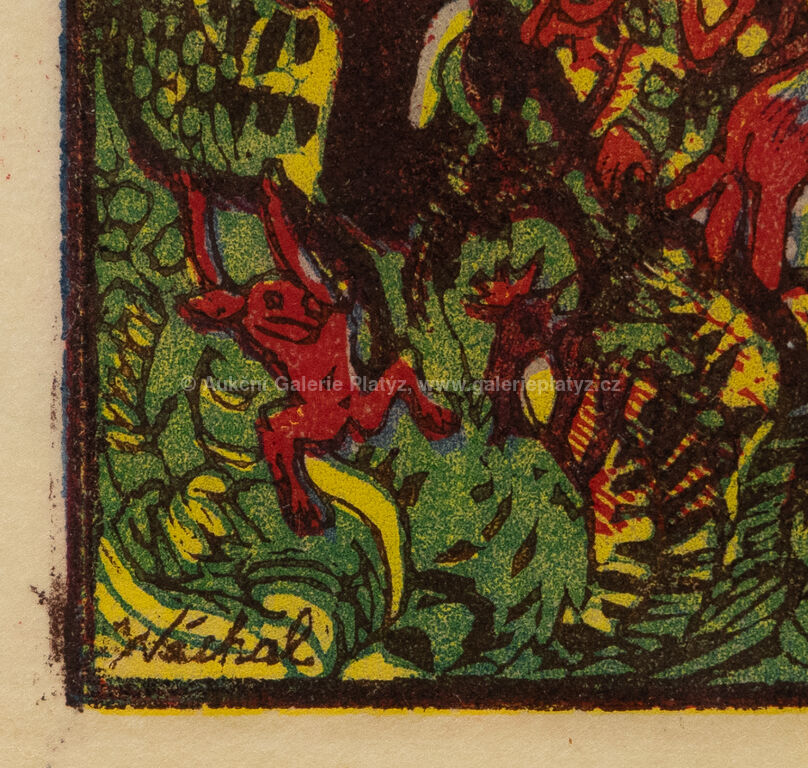barevný dřevoryt/papír, rozměr ve výřezu 21 x 21,5 cm, značeno vlevo dole v tisku, paspartováno, zaskleno, rámováno