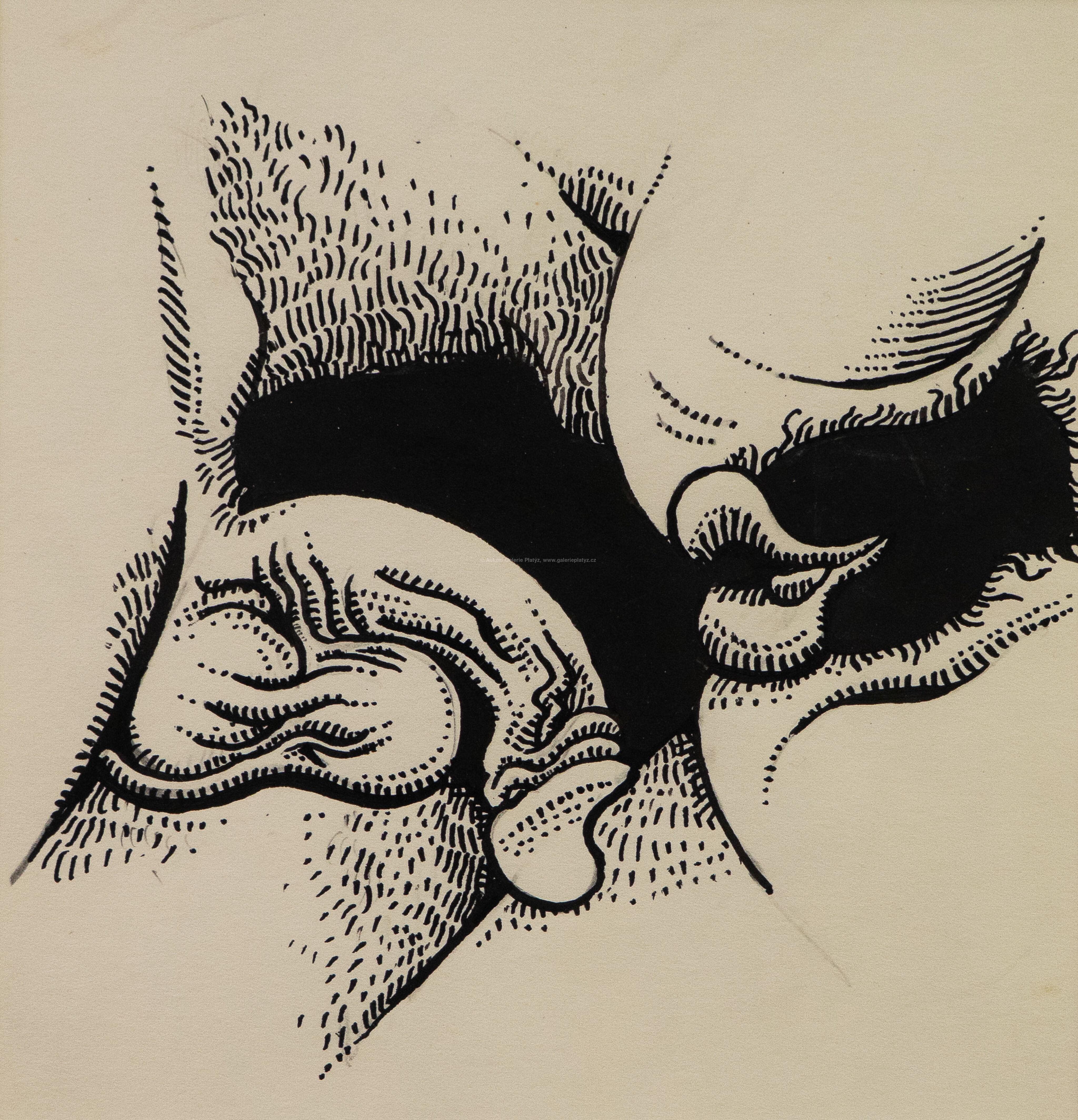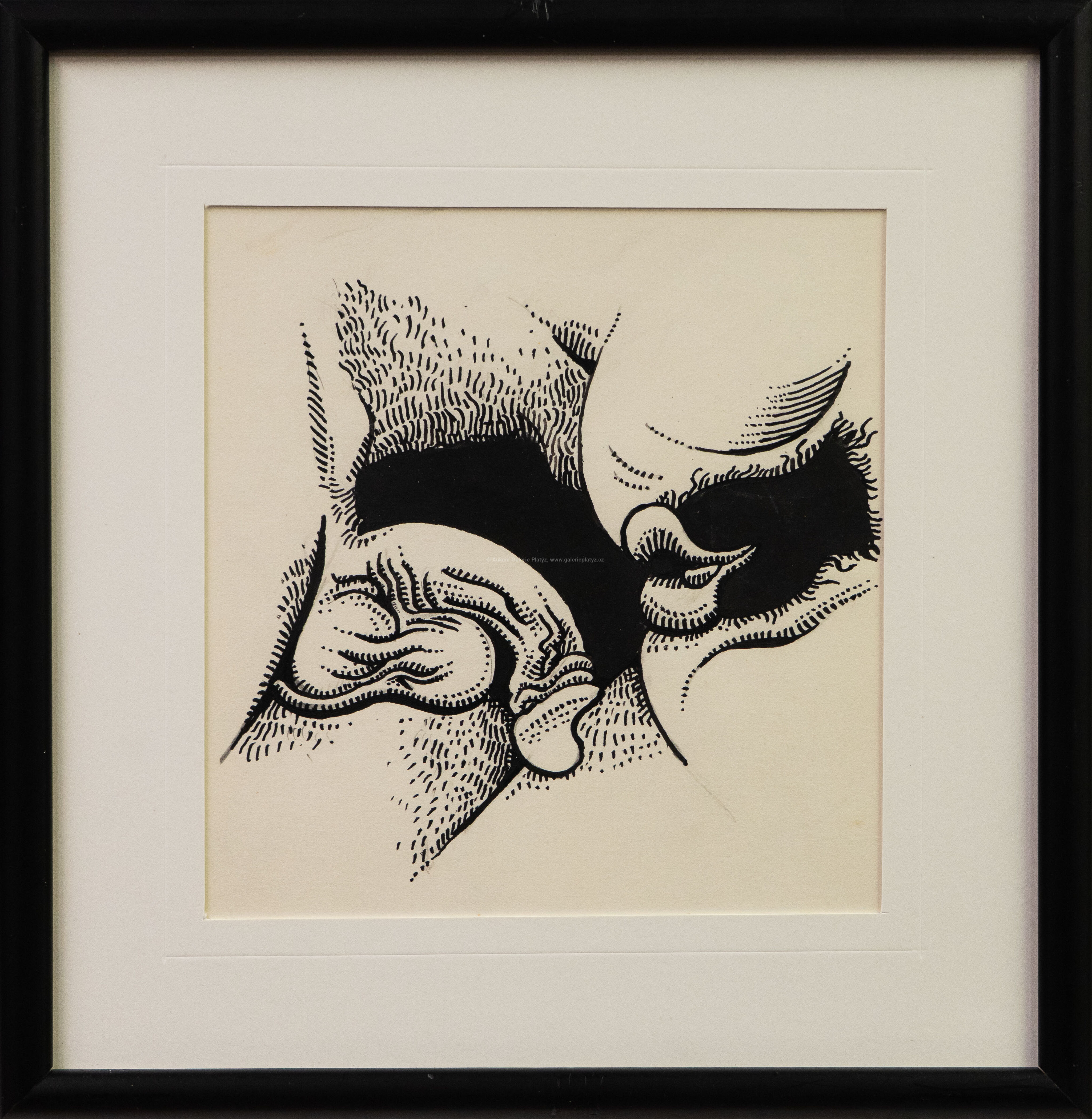 tuš/papír, rozměr ve výřezu 20,5 x 20 cm, neznačeno, paspartováno, zaskleno, rámováno