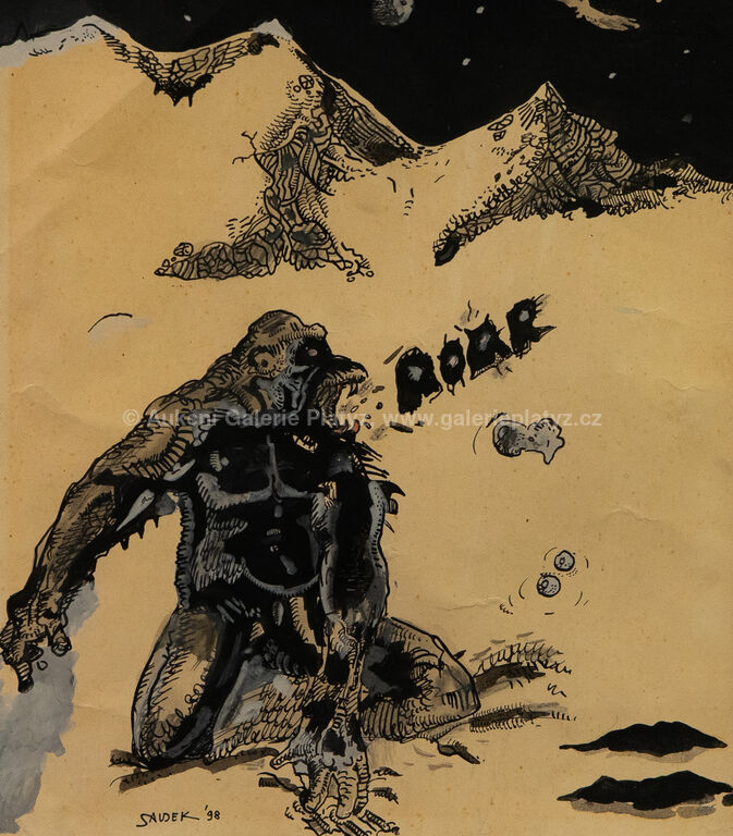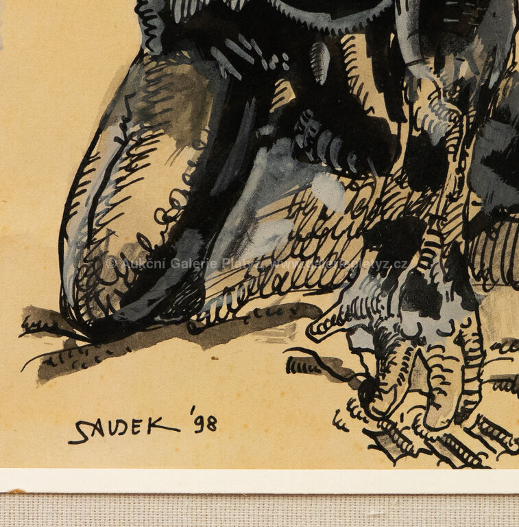 kombinovaná technika, tuš/akvarel/papír, rozměr ve výřezu 24 x 21 cm, značeno a datováno vlevo dole, paspartováno, zaskleno