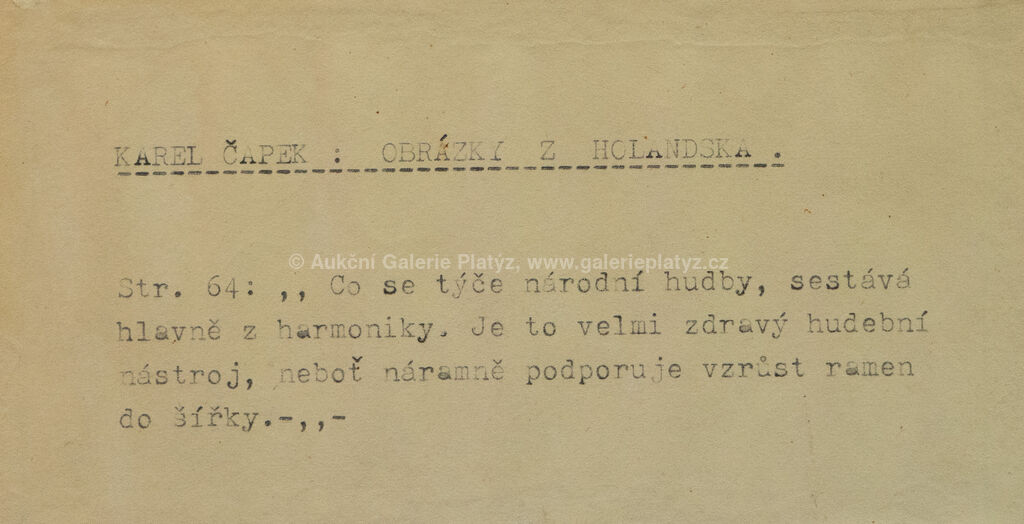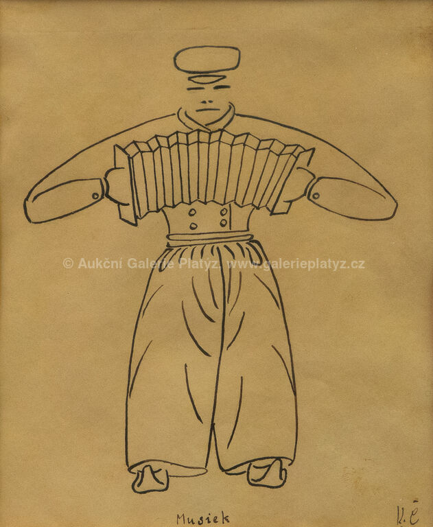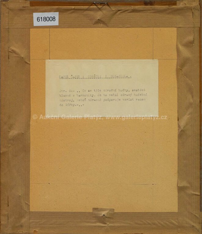 kresba tuší/papír, rozměr ve výřezu 16,5 x 13,5 cm, značeno a popsáno ve spodní části, paspartováno, zaskleno, rámováno, publikováno v knize Obrázky z Holandska, Karel Čapek 1932, str. 64