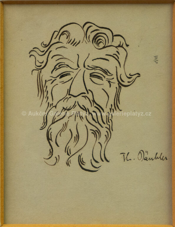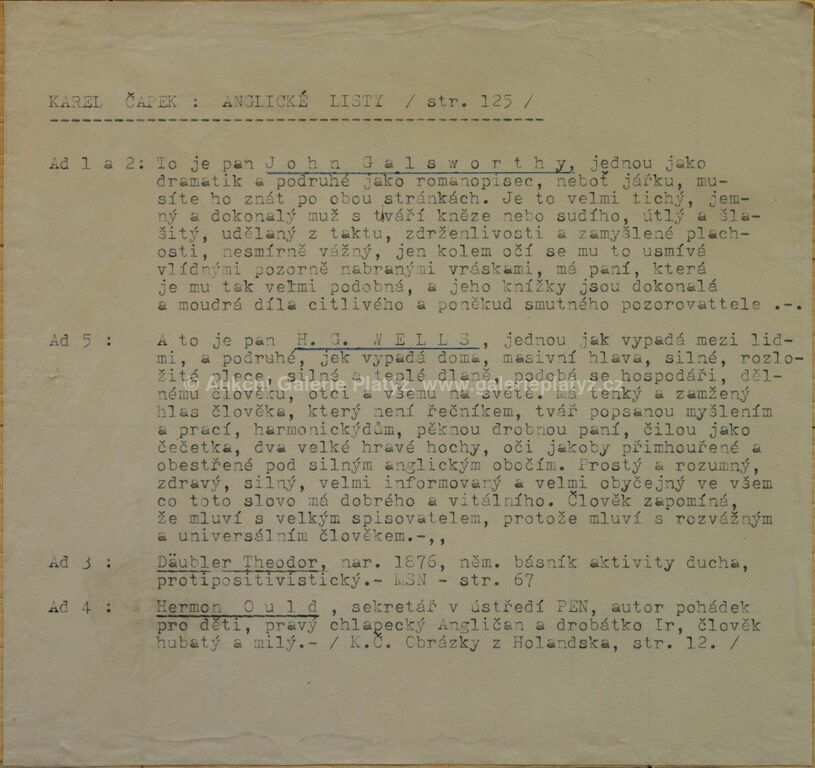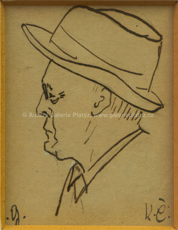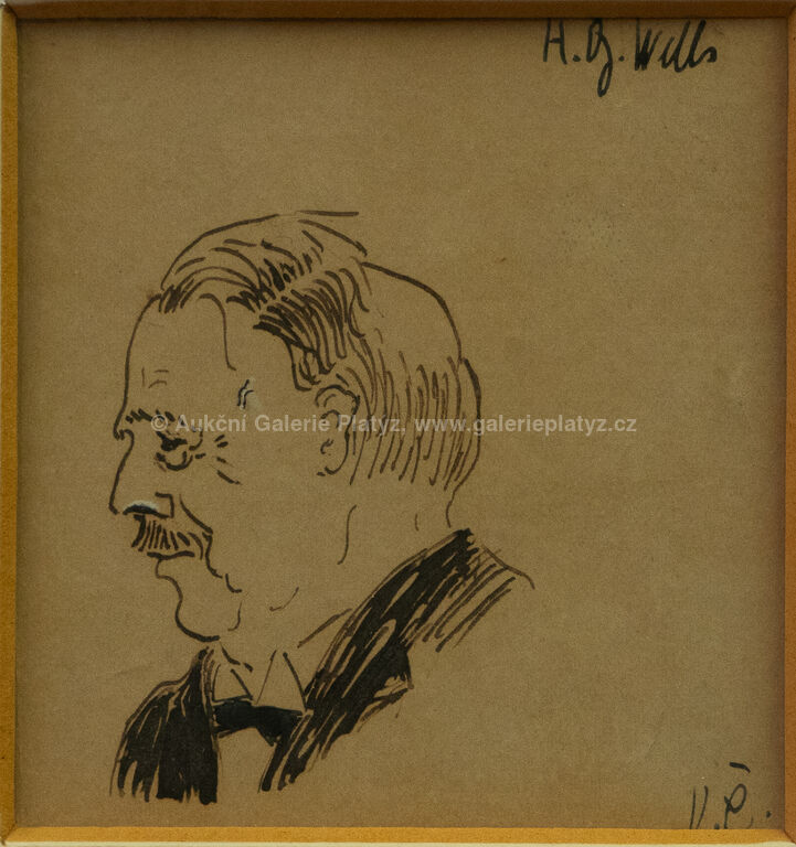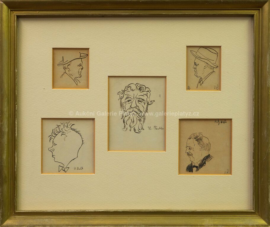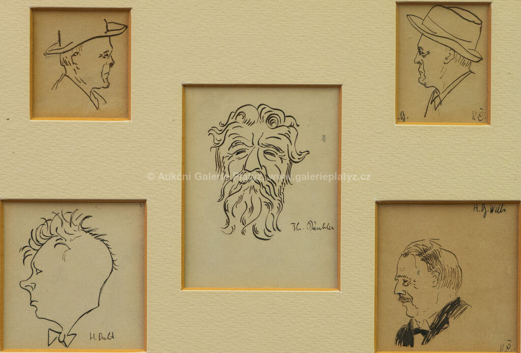 5 x tuš/papír, rozměr ve výřezu 2 portréty 6 x 5 cm, dva portréty 8 x 7,5 cm, jeden portrét 10,5 x 8 cm, paspartováno, zaskleno, rámováno, popsáno na zadní straně, publikováno v knize Anglické listy, Karel Čapek 1924, str. 125, portréty: John Galsworthy, H.G.Wells, Däubler Theodor, Hermon Ould