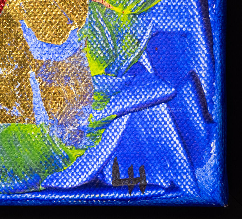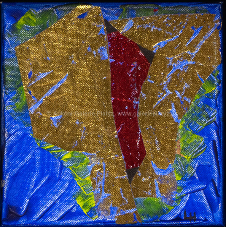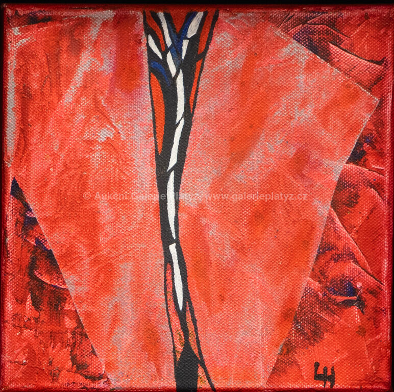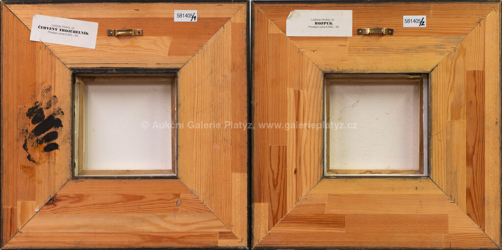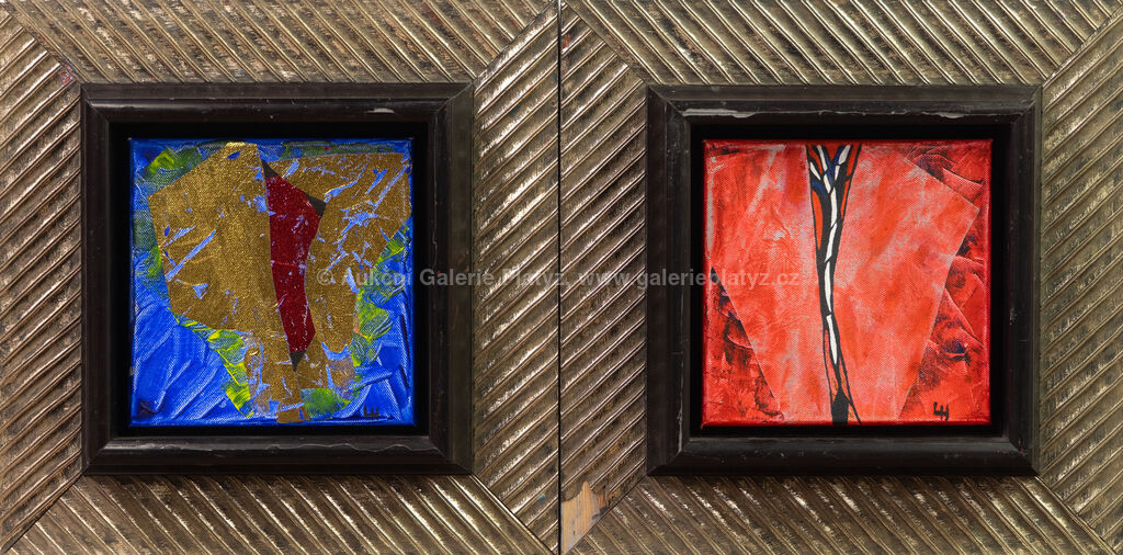 Červený trojúhelník: akryl/plátno, rozměr 20 x 20 cm, značeno vpravo dole, rámováno, poškozený rám, Rozpuk: akryl/plátno, rozměr 20 x 20 cm, značeno vpravo dole, rámováno, poškozený rám