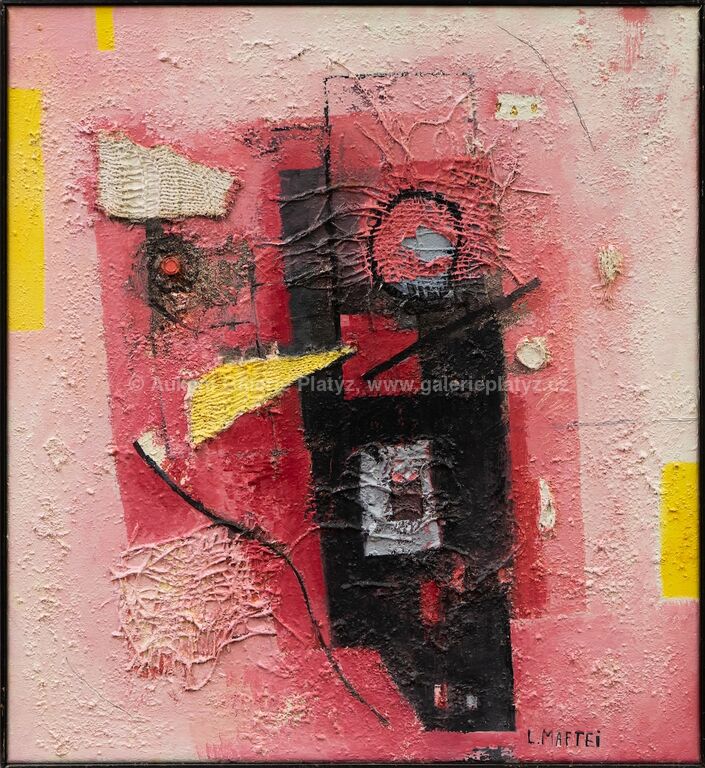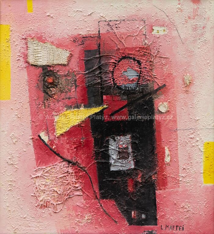 kombinovaná technika, koláž, strukturální malba/olej/plátno, rozměr 60 x 55,5 cm, značeno vpravo dole, olištováno