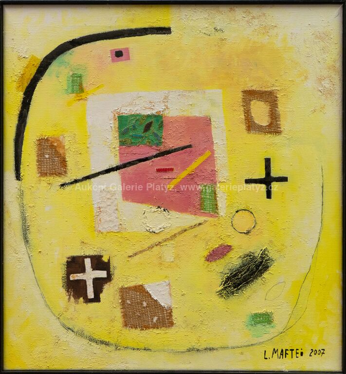 kombinovaná technika, koláž, strukturální malba/olej/plátno, rozměr 70 x 65 cm, značeno a datováno vpravo dole, olištováno