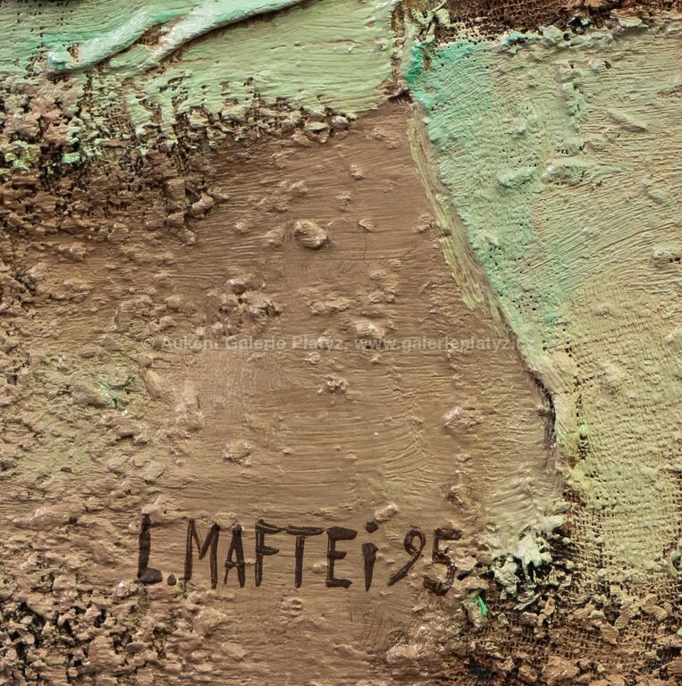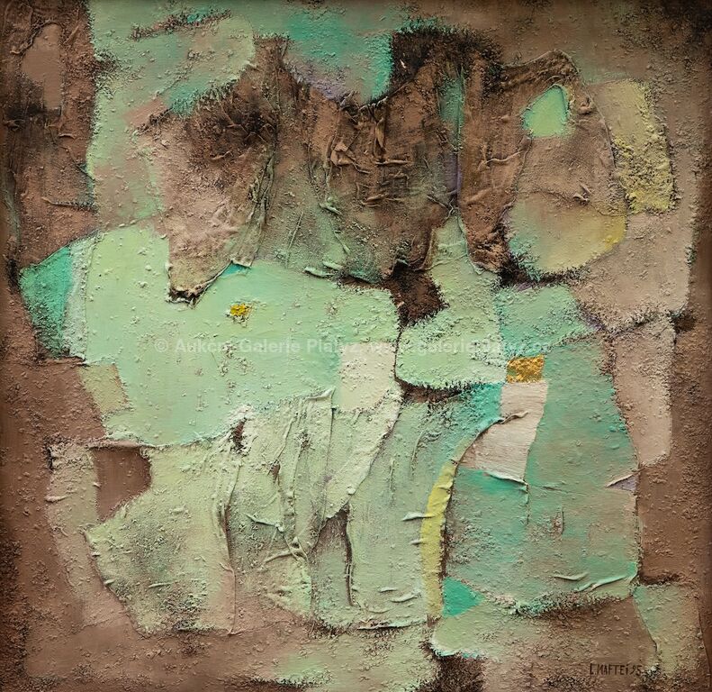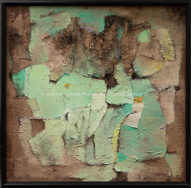 kombinovaná technika, koláž, strukturální malba/olej/plátno, rozměr 73 x 75 cm, značeno a datováno vpravo dole, rámováno, oděrky na rámu