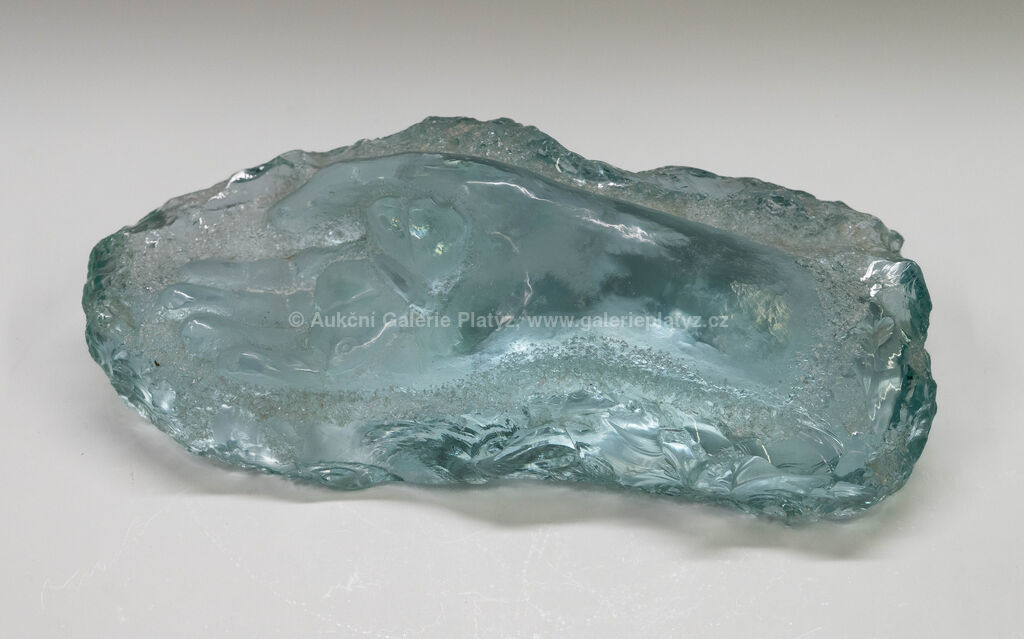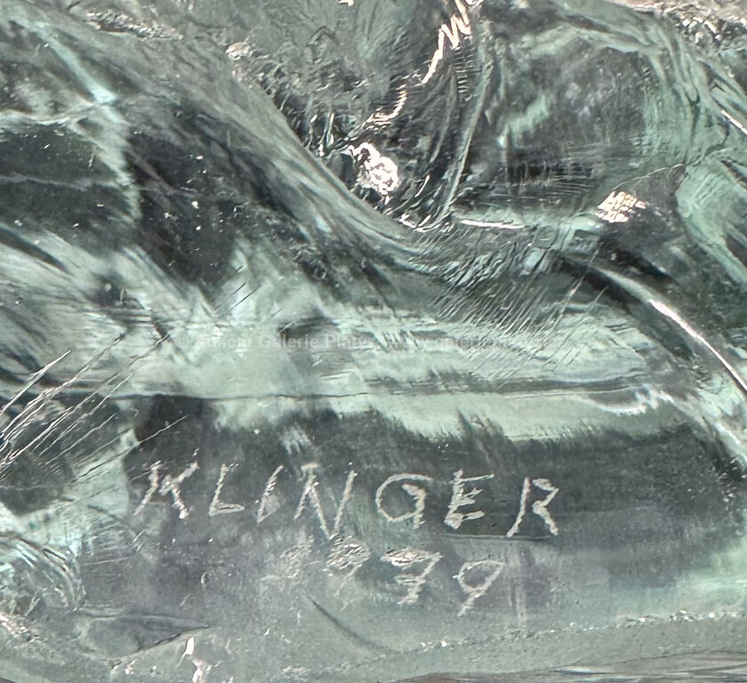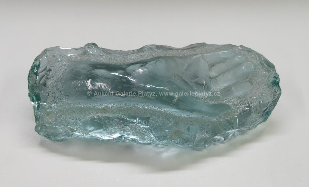 skleněná plastika, sklo čiré, nazelenalé, broušené a tesané, rozměr 13 x 30 x 8 cm, značeno a datováno ve spodní části