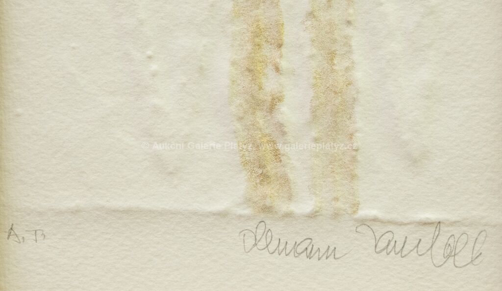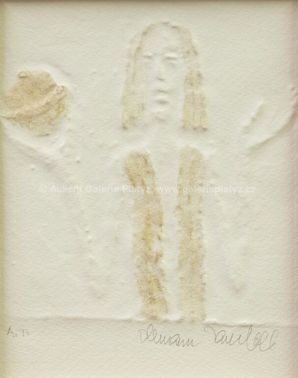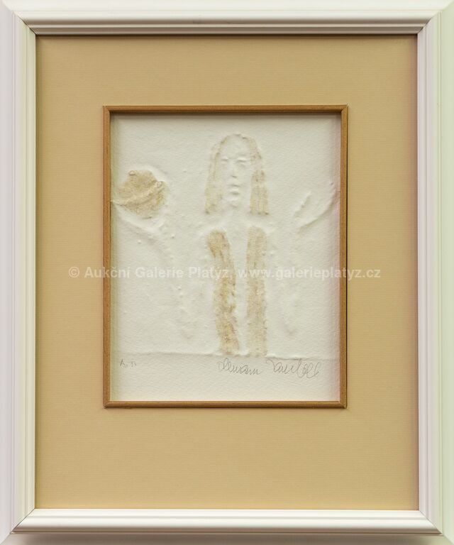 papírový reliéf/zlato/ruční papír, rozměr ve výřezu 18,5 x 14,5 cm, značeno a popsáno ve spodní části, paspartováno, zaskleno, rámováno, konzultováno a pravost potvrzena Nadačním fondem Kmentová Zoubek (vznik 1997)