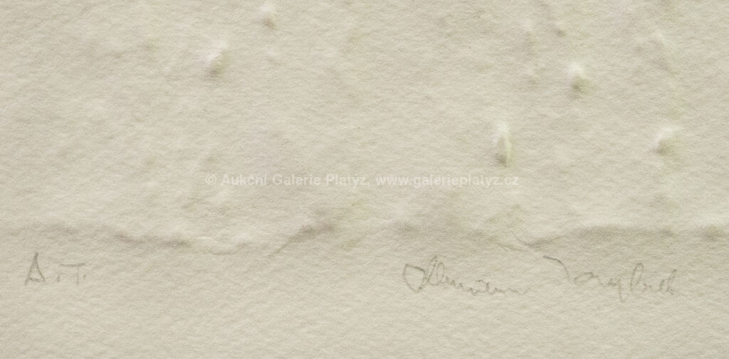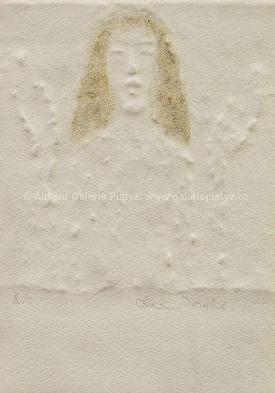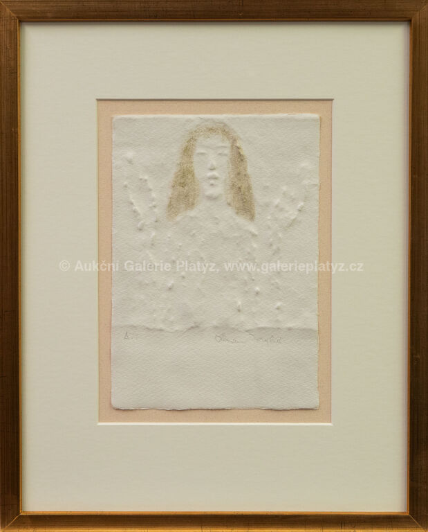 papírový reliéf, ruční papír/zlato, rozměr listu cca 21,5 x 15 cm, značeno a popsáno ve spodní části, paspartováno, zaskleno, rámováno, konzultováno a pravost potvrzena Nadačním fondem Kmentová Zoubek, vznik 1996