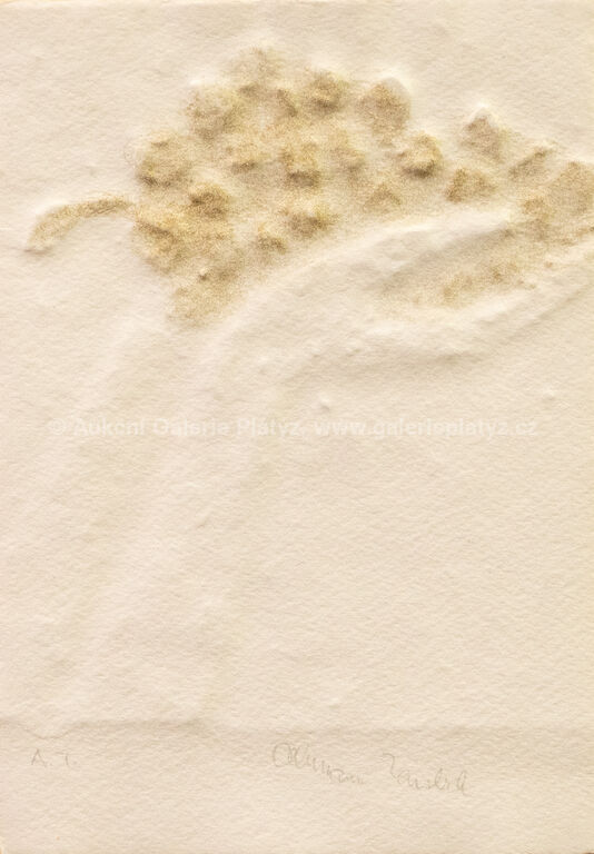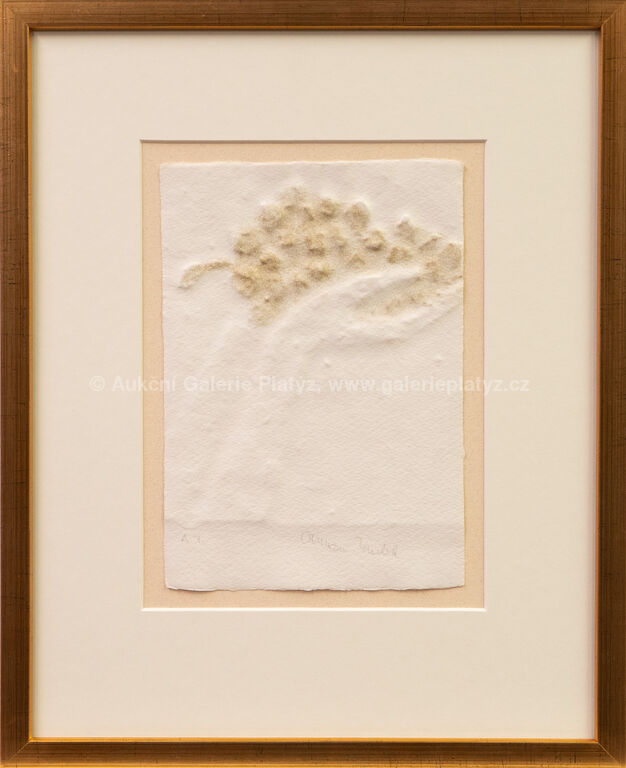 papírový reliéf, ruční papír/zlato, rozměr cca 21 x 15 cm, značeno a popsáno ve spodní části, paspartováno, zaskleno, rámováno, konzultováno a pravost potvrzena Nadačním fondem Kmentová Zoubek, vznik 2009