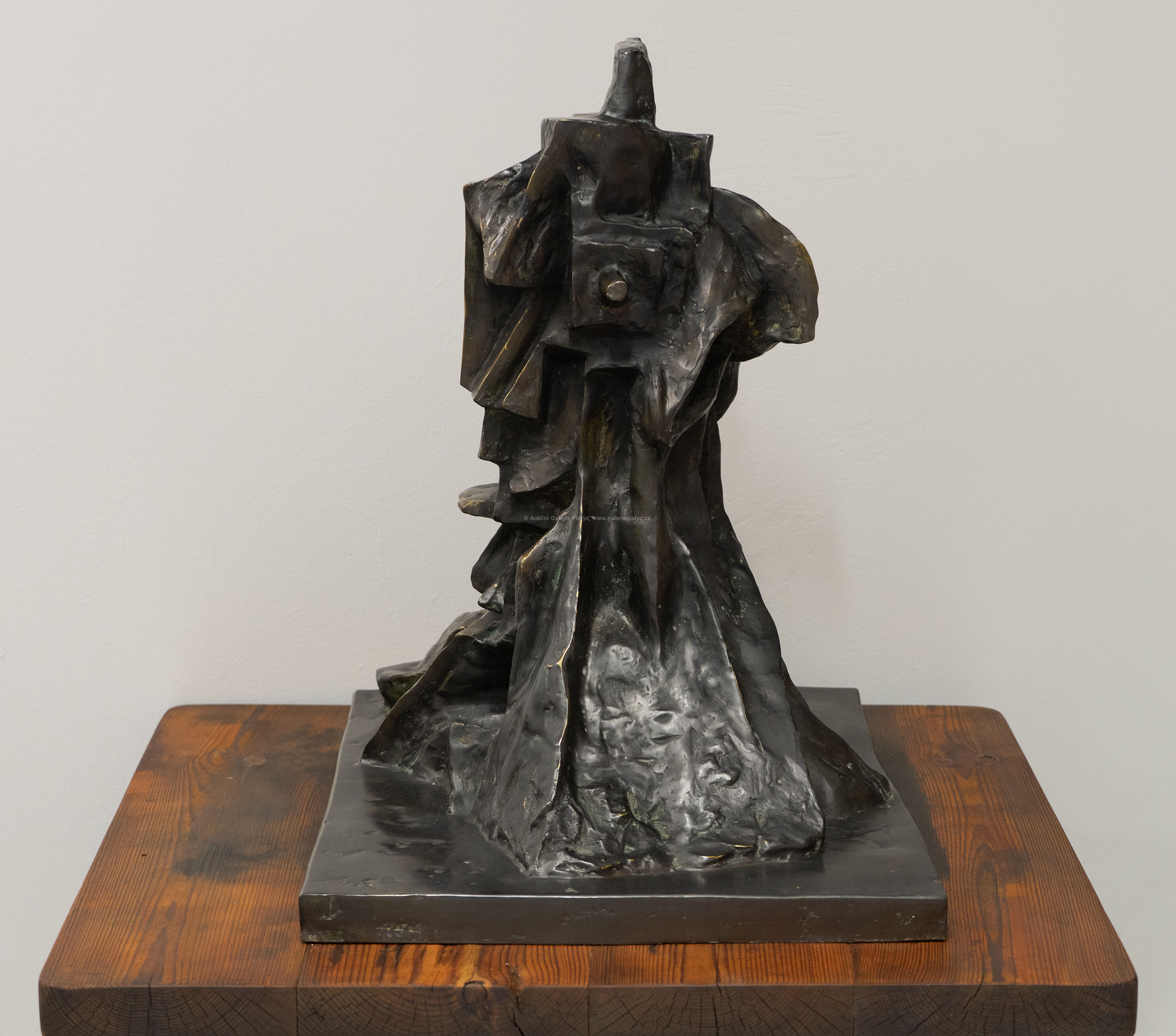 bronzová plastika na dřevěném podstavci, patinovaný bronz, celkový rozměr 60 x 44 x 58 cm, značeno na plintu