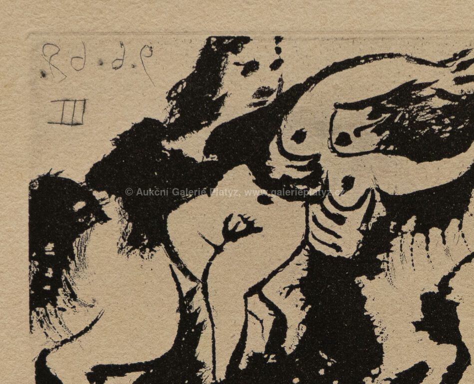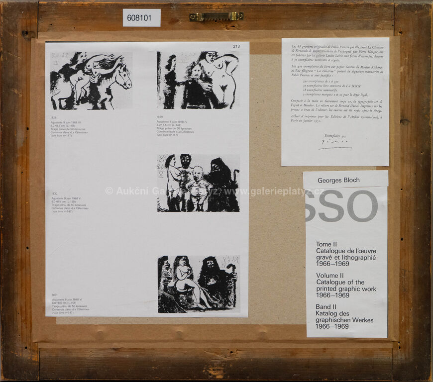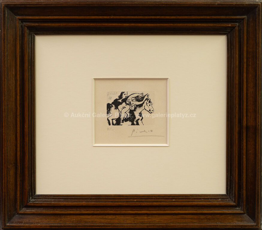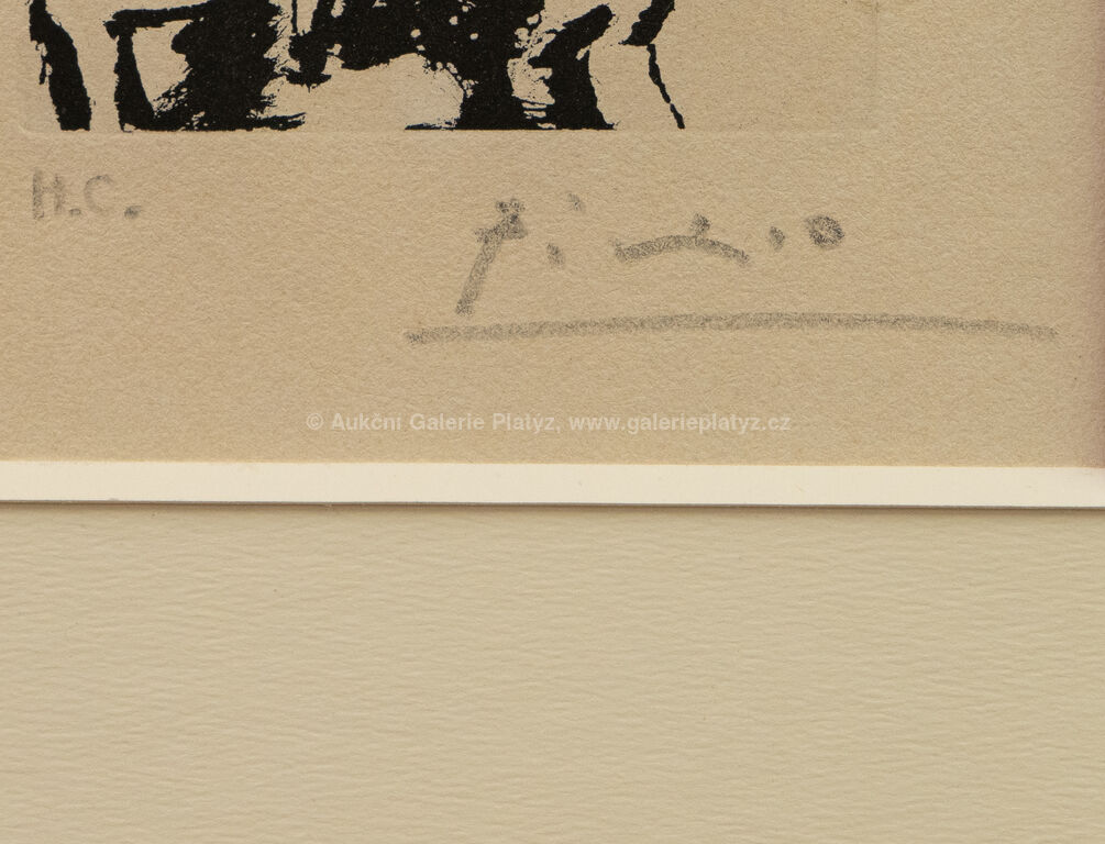 lept/papír, rozměr ve výřezu 11 x 12,5 cm, značeno a popsáno ve spodní části, datováno a popsáno vlevo nahoře v tisku, papír Richard-de-Bas s vodoznakem La Celestine, paspartováno, zaskleno muzeálním sklem, rámováno, neprodejný tisk určený pro spolupracovníky a tiskaře, zakoupen v 70. letech v Paříži malířem Karlem Chabou, z jehož pozůstalosti pochází, list uveden v soupisu Picassova grafického díla Bloch